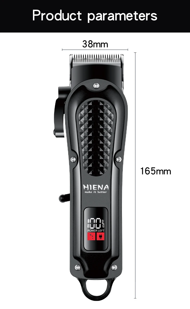 The Hiena HYN-212 electric hair clipper features a rechargeable stainless steel blade, ensuring long-lasting performance and durability.