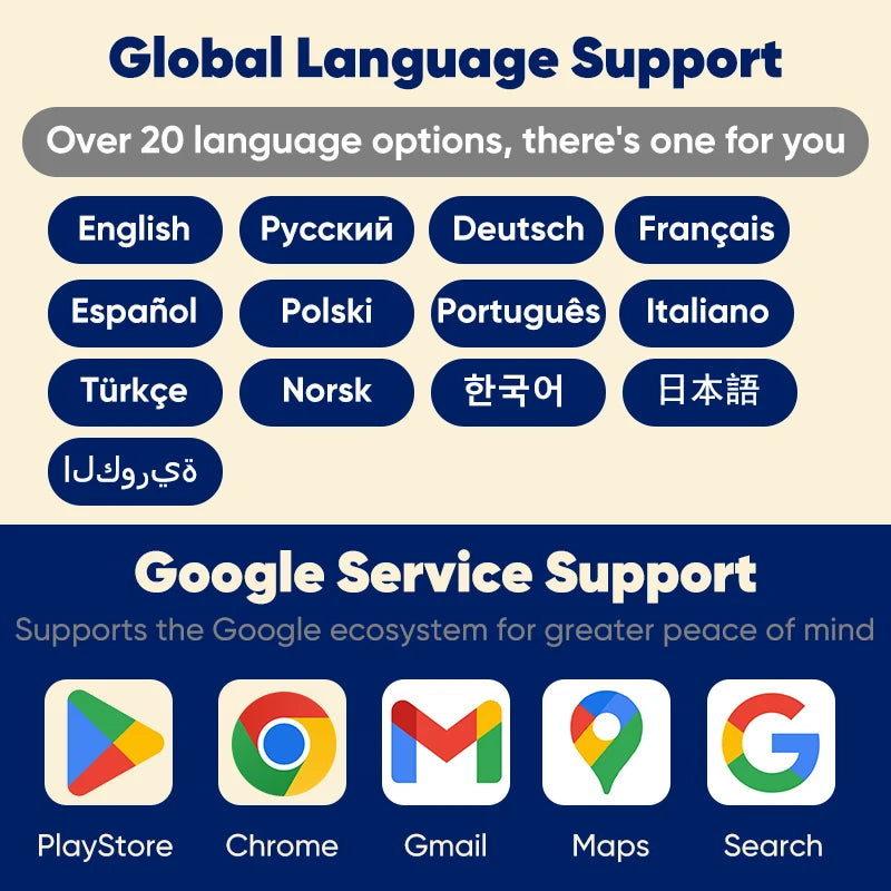 Our phones support multiple languages and come pre-installed with Google services for a seamless, user-friendly experience, wherever you are.