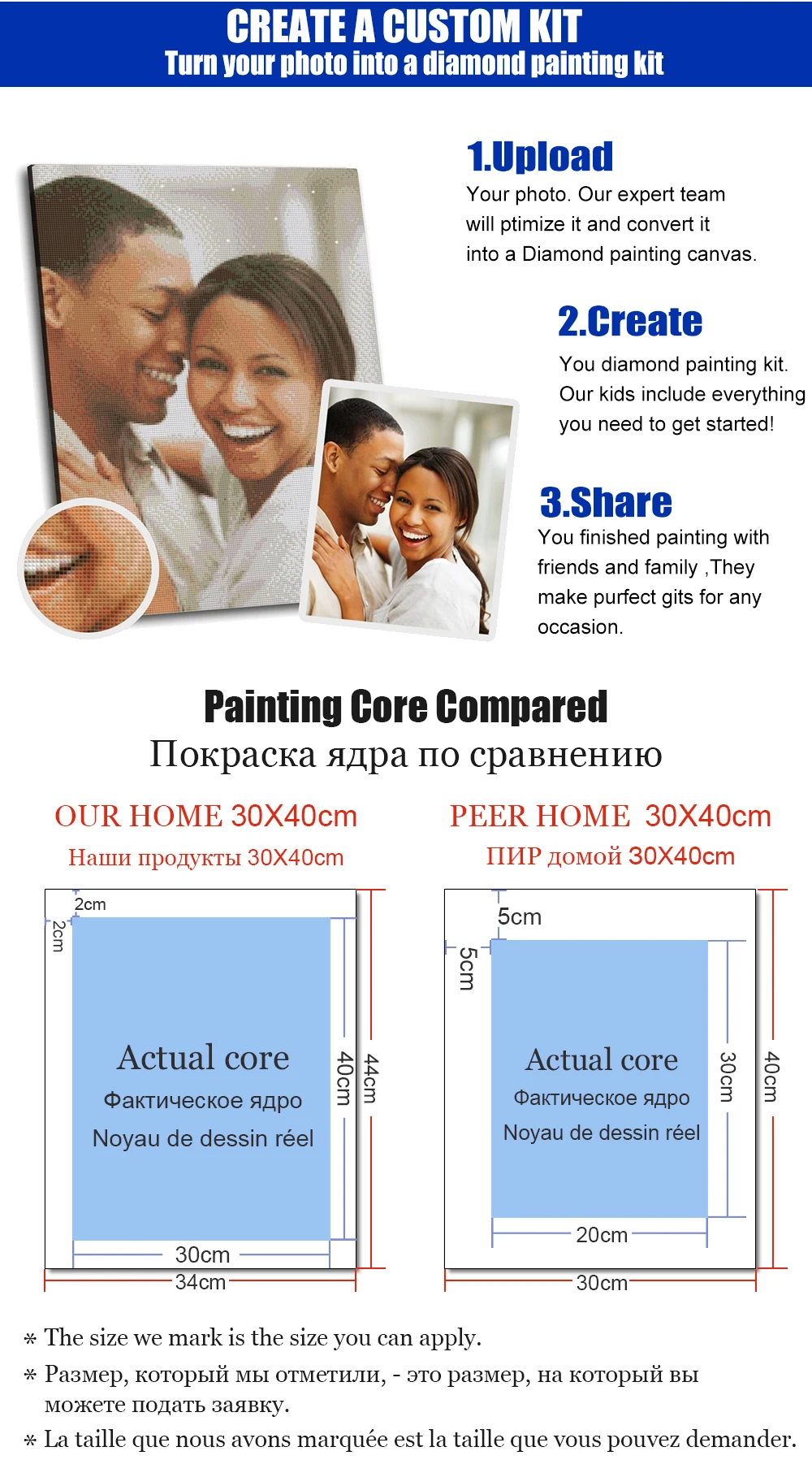 1. de snijden, ontwerp en productie van de foto kan veroorzaken grootte afwijking (fluctuatie van 1-2cm). Na ontvangst van de diamant schilderij, kies de fotolijst volgens de grootte van de diamant schilderij.