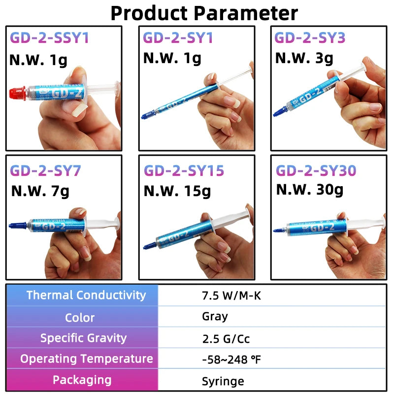 The GD-2 has superior thermal conductivity. In contrast to similar products of other brands, you will be admired by its amazing high cost-effective performance. By using the GD-2, each performance maintains stability for a long service life, has durability at least 8 years without reapplied. lt is especially suitable for high standards of games and super frequency players on cooling system.