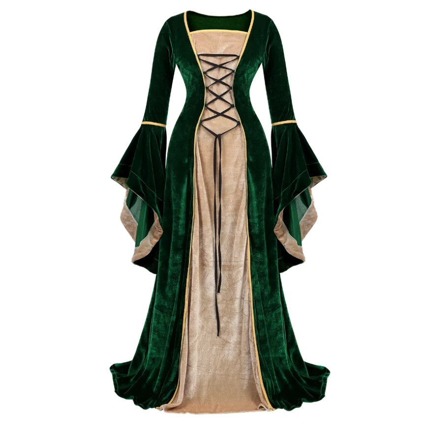 -- Lace up design, long bell sleeves detail, vintage style, renaissance medieval Irish costume, Halloween cosplay dress, gothic over dress.