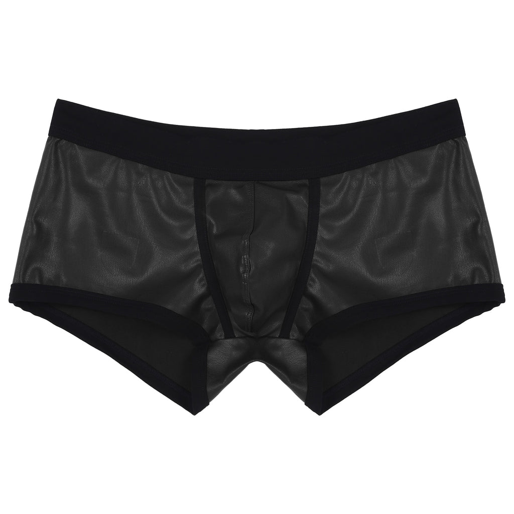 Men Low Waist Faux Leather Boxer Shorts Swimming Trunks Bulge Pouch Elastic Waistband Underpants.