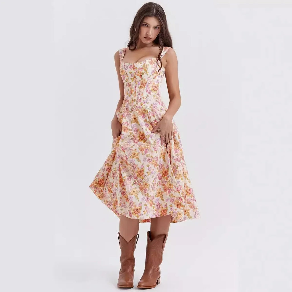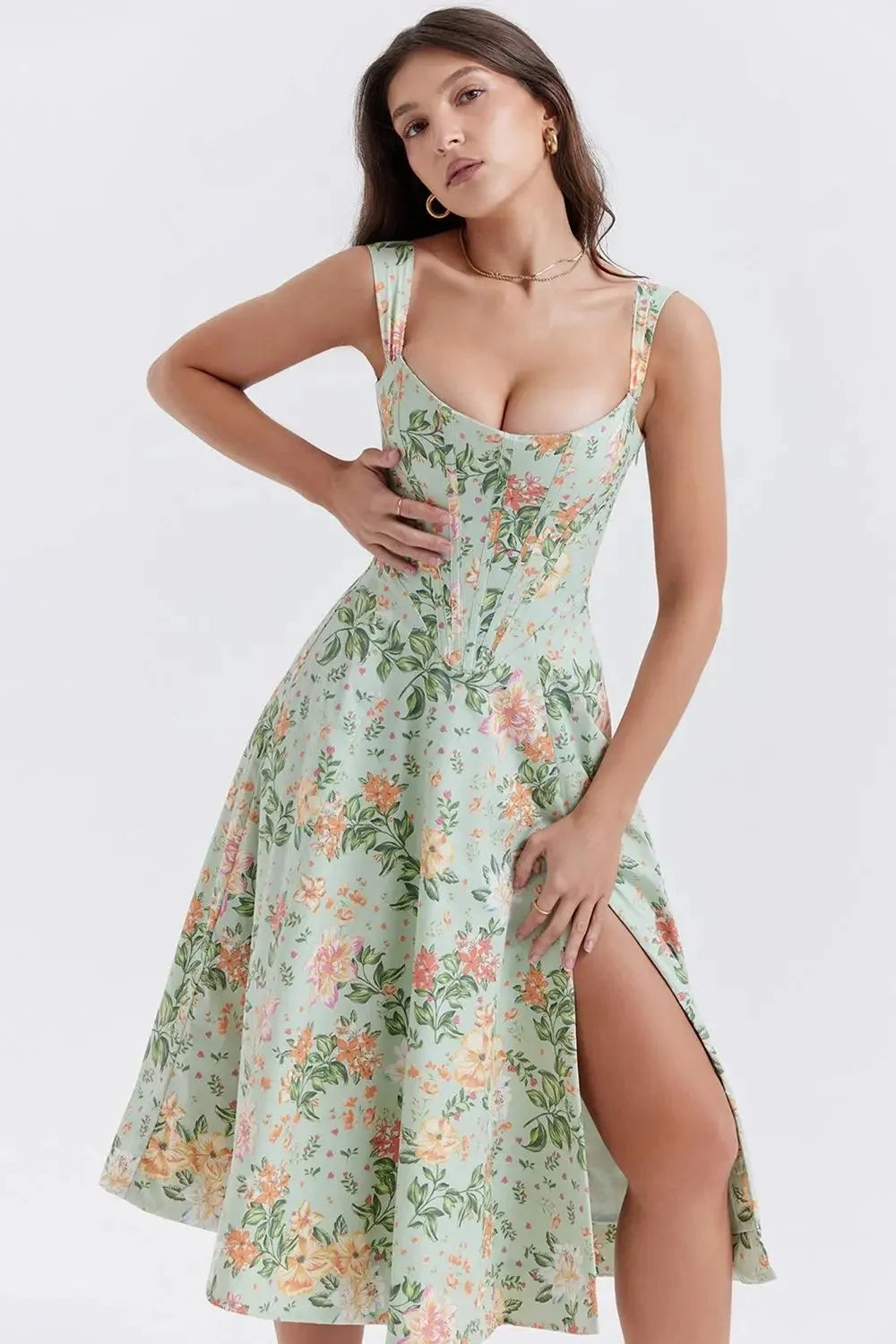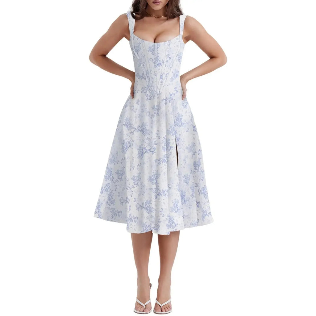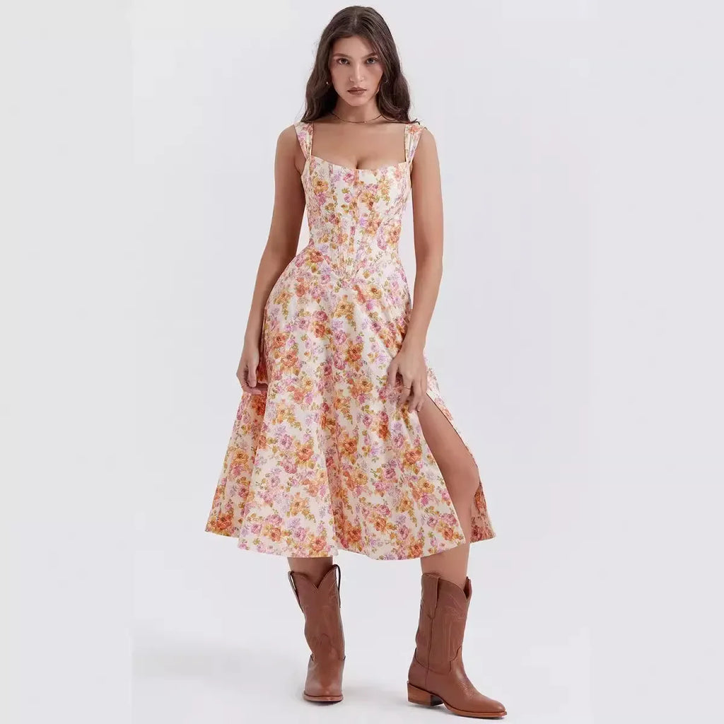 Summer New Elegant Slimming Long Dress Tank Sexy Side Slit Fragment Flower Dress Women's Waist-Fitted Clothing