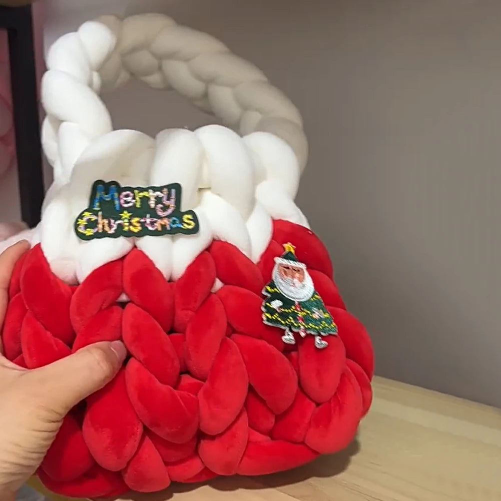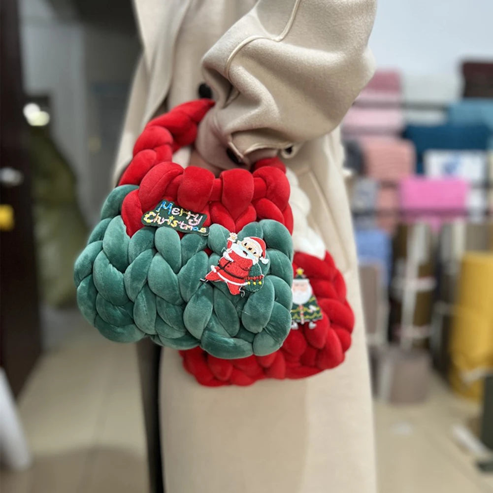 Women Hand-Woven Bag Icelandic Wool Chunky Knit Bag Hollow Out Soft Contrast Color with Short Handle Ladies Christmas Santa Bag