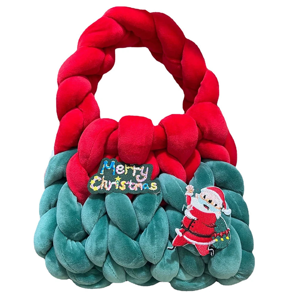 Women Knitted Handbag Icelandic Wool Top-handle Bags Hollow Out Soft Contrast Color with Short Handle Ladies Christmas Santa Bag