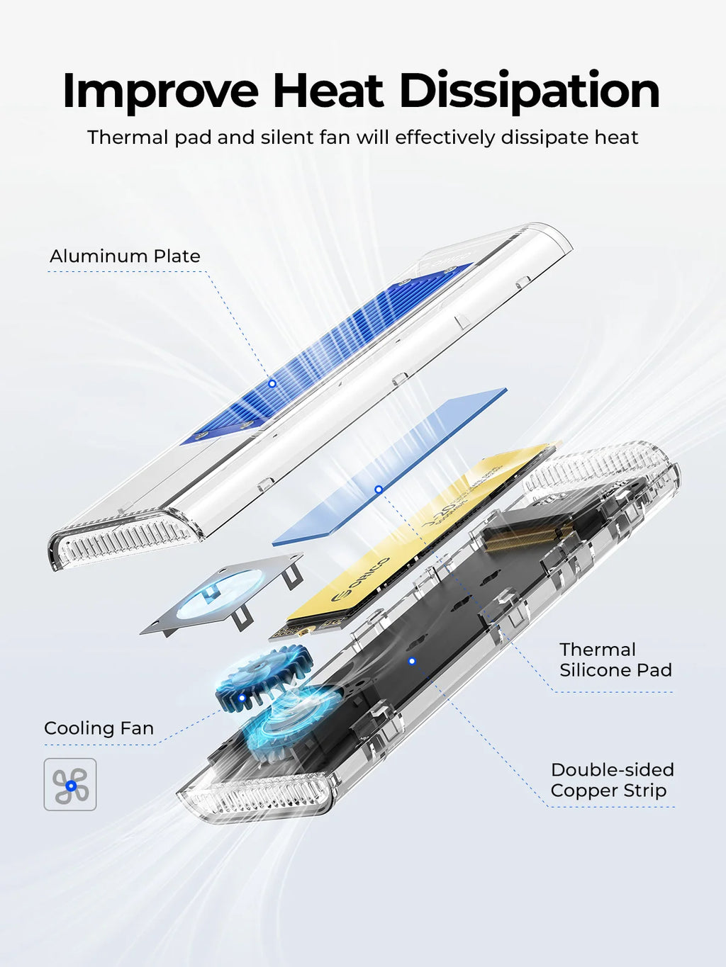 Built-in metal cooling vest and built-in fan,silicone thermal pad and aluminium body, heat dissipation is fast.