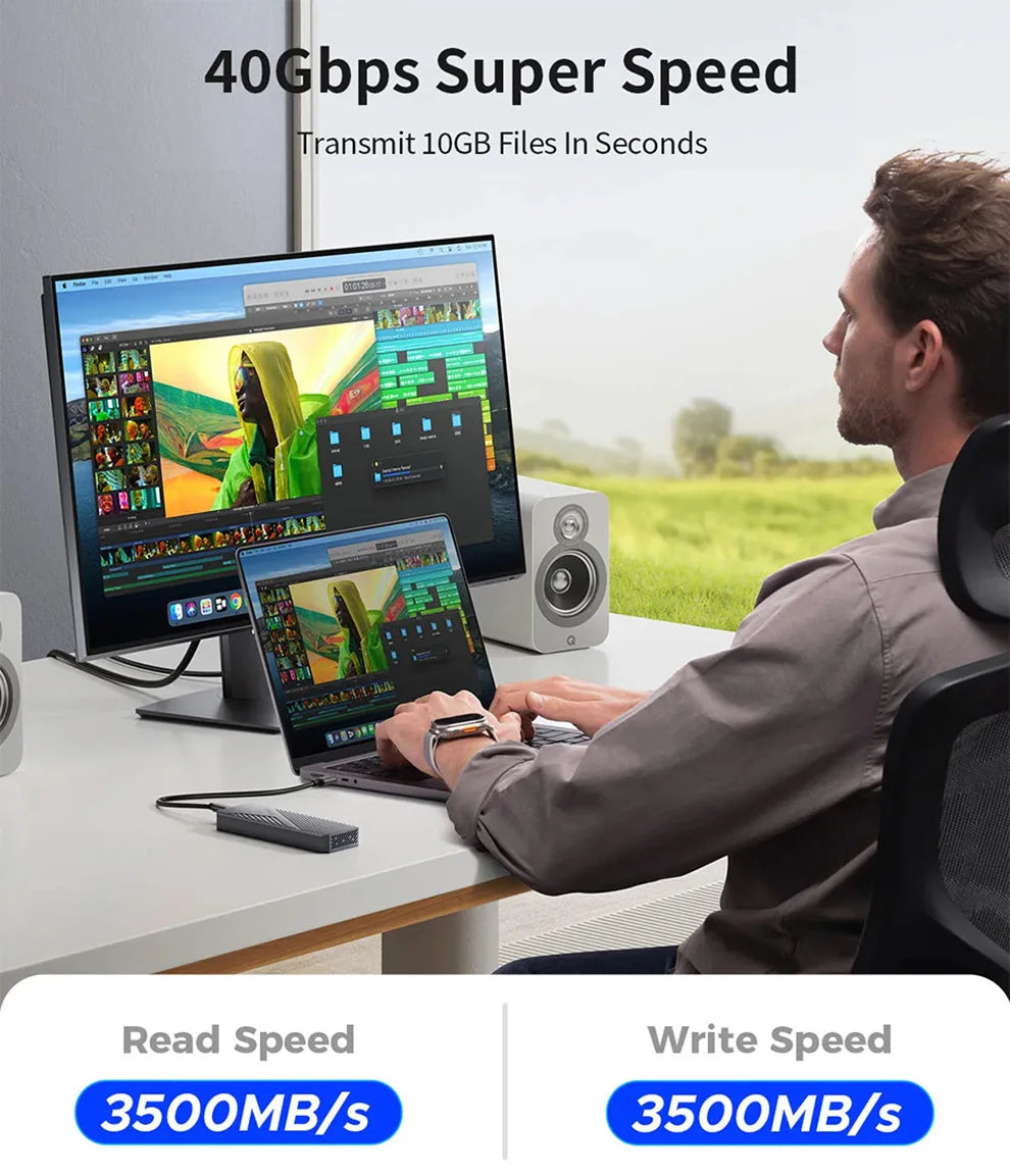 the ssd enclosure read speed: 3500MB/s, write speed: 3500MB/s.