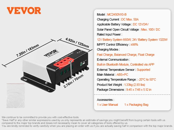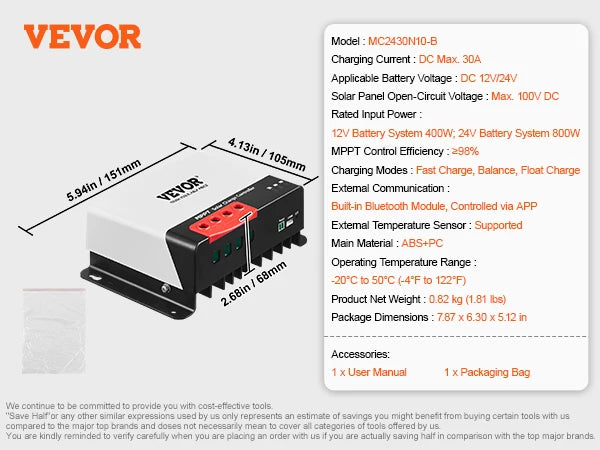Product Dimensions: 151 x 105 x 68 mm (5.94 x 4.13 x 2.68 in) Product Net Weight: 0.82 kg (1.81 lbs) Package Dimensions: 200 x 160 x 130 mm (7.87 x 6.30 x 5.12 in) Charging Current (DC): Maximum 30A Applicable Battery Voltage (DC): 12V/24V Auto Rated Input Power: 12V/400W; 24V/800W Solar Panel Open-Circuit Voltage: Max. 100V DC MPPT Control Efficiency: ≥98% Charging Modes: Fast Charge, Balance, Float Charge External Communication: Built-in Bluetooth Module, Control via Mobile App External Temperature Sensor: Supported Main Material: ABS + PC Operating Temperature Range: -20°C to 50°C (-4°F to 122°F) Item Model Number: MC2430N10-B/li>