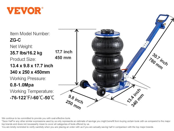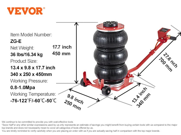 • Versatile Lifting Range: Experience the freedom to work on vehicles of different heights. Our air bag jack boasts a lifting height range of 5.5-17.7 inches (140 mm-450 mm), ensuring it adapts perfectly to your maintenance needs. Enjoy hassle-free repair and maintenance work with this convenient feature.