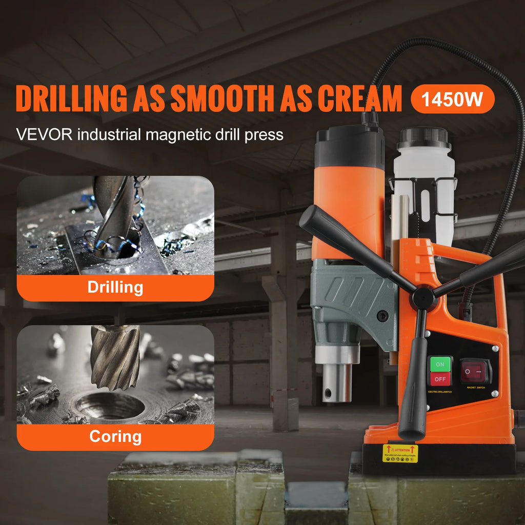 The 1450W Electromagnetic Drill Press combines high-powered performance with precision drilling. Featuring a robust 1450-watt motor, this tool delivers exceptional power to drill through various materials with ease. Its 12,800N magnetic holding force ensures a secure grip on steel or iron surfaces, keeping the drill stable and precise at any speed. Crafted from durable titanium magnesium alloy, this versatile drill press is perfect for demanding tasks in construction, steel fabrication, and heavy industries.