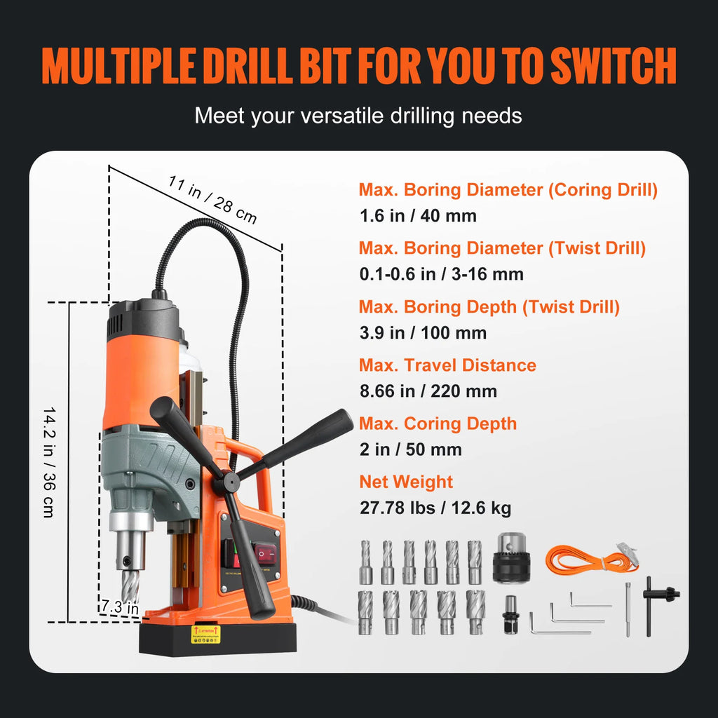 Superior Magnet Power: Equipped with a 12800N magnetic base, the drill anchors securely to metal surfaces, preventing unwanted movement. The 1450W motor powers through tough materials with a speed range of 0-800 RPM, achieving depths and diameters of 50mm.