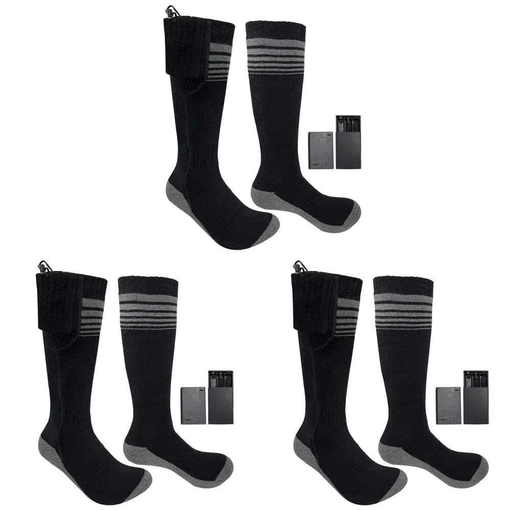 1.Superior Quality and Versatility: Our winter heated socks are crafted from 100% brand new high-quality materials, ensuring durability and functionality. Made with breathable and quick-drying cotton fabric, these thermal socks offer excellent moisture-wicking properties. The thickened design provides extra insulation, while the slim and delicate electric module ensures comfort and convenience. Specification: Origin: Mainland China Material: Heating Pad+Knitted Cotton Size: One Size Fits All (Sizes 35-45) Color: Black+Gray Material: Polyester Fiber Number Of Pieces: 1pc Cylinder Height: High Cylinder