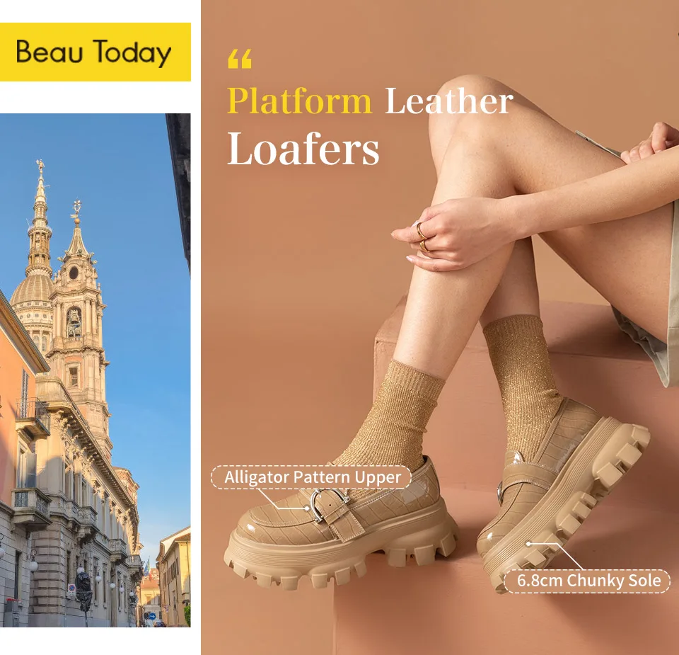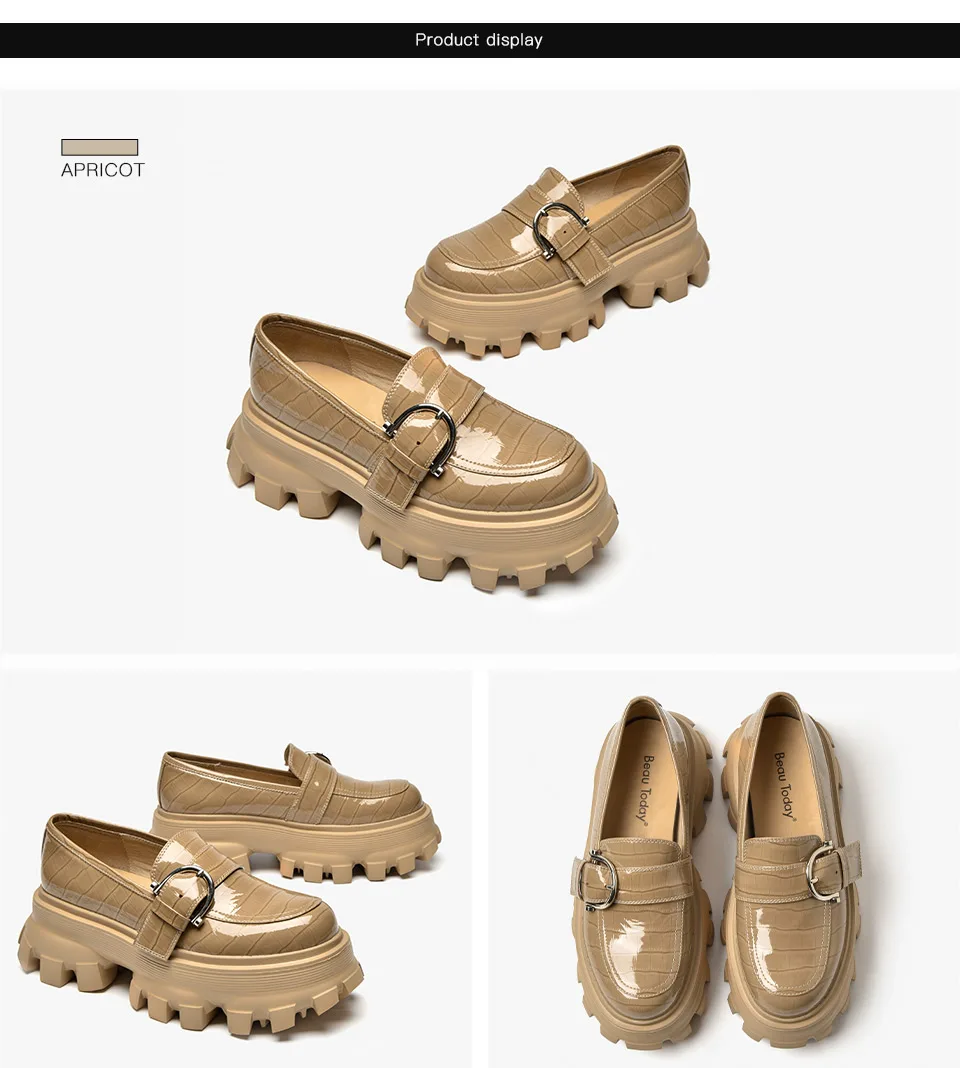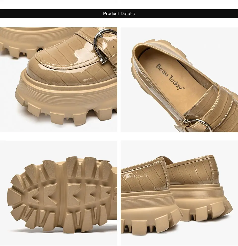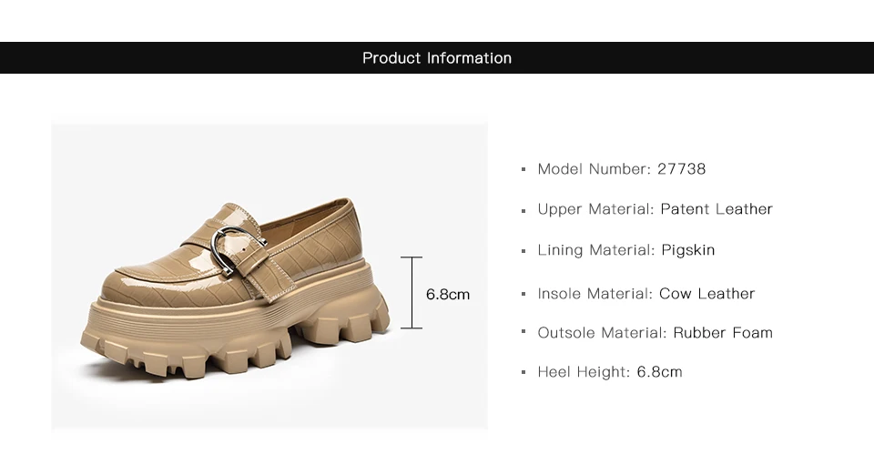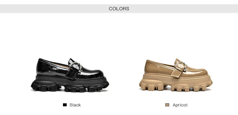 Patent leather upper with alligator pattern Breathable pigskin lining Genuine cow leather insole Lightweight rubber foam outsole Round toe with buckle decor Slip-On style Handmade Sole thickness: 6.8cm Available colors:Apricot, Black Shoes with box