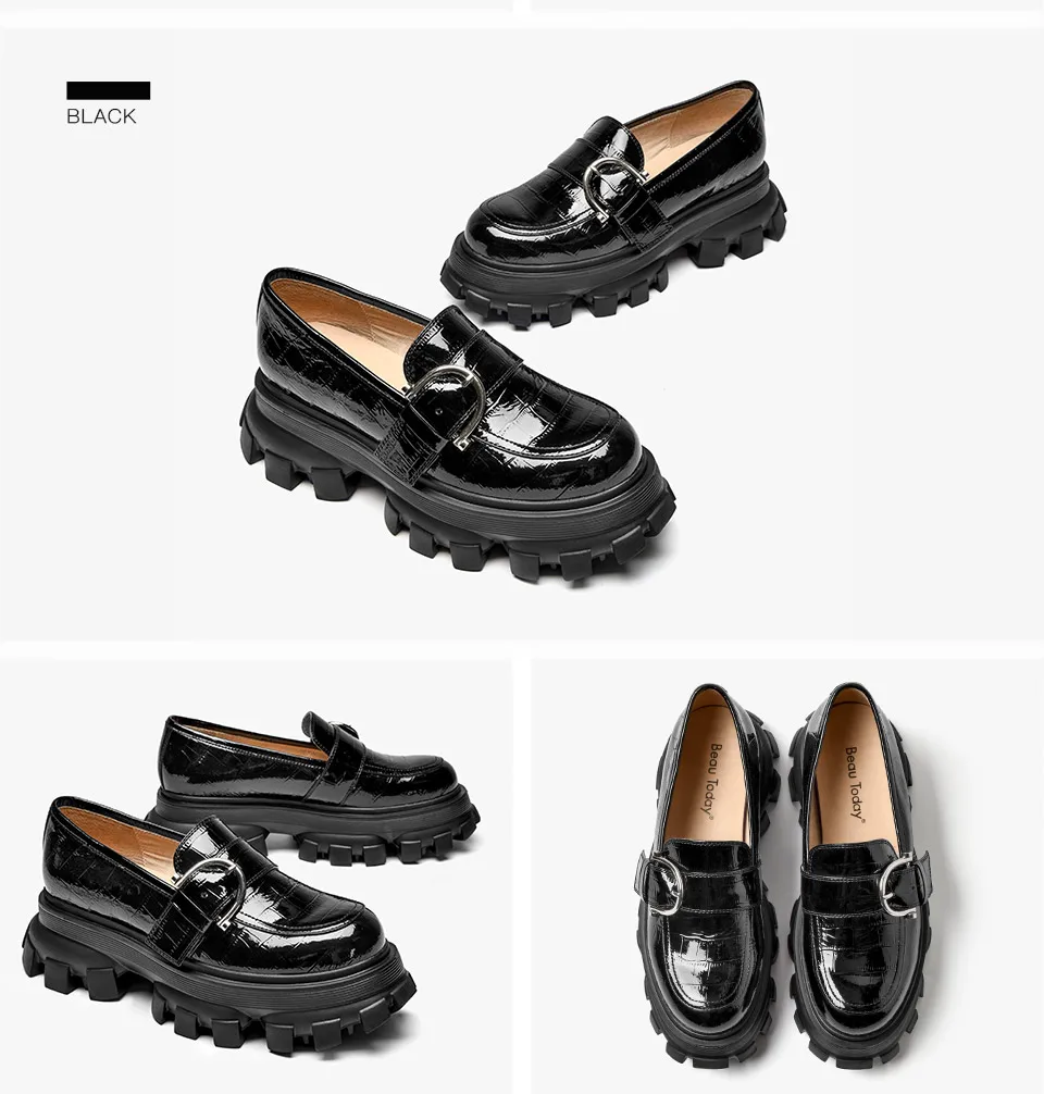 BeauToday Platform Shoes Women Patent Leather Flats Alligator Pattern Round Toe Buckle Decoration Ladies Slip On Handmade 27738