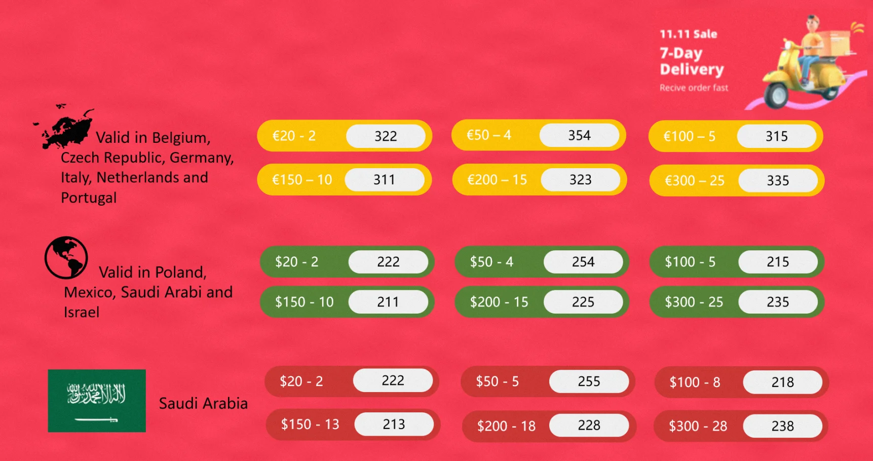 11.11 Sale . Items that 7 Day Delivery can use the following promo codes.Valid in: Israel, Poland, Mexico, Saudi Arabia, Belgium, Czech Republic, Germany, Italy, Netherlands, Portugal.