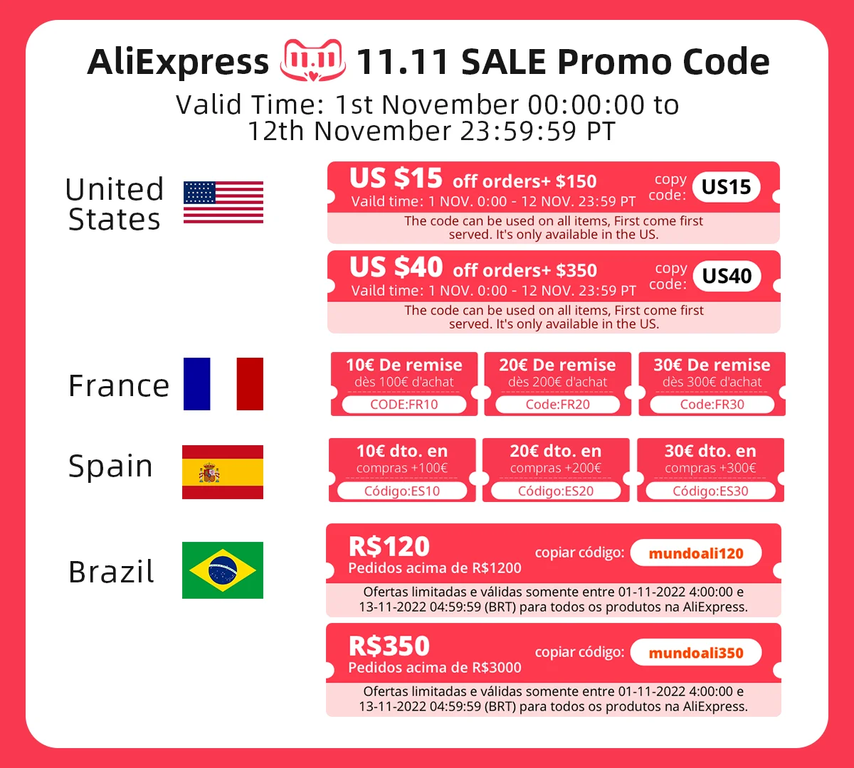 11.11 Sale. Promo codes available in some countries.Valid in United States,France,Spain,Brazil.