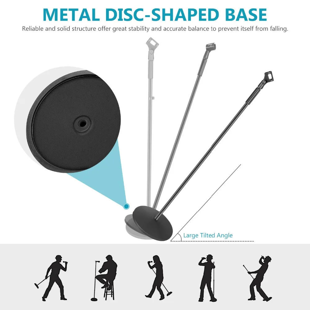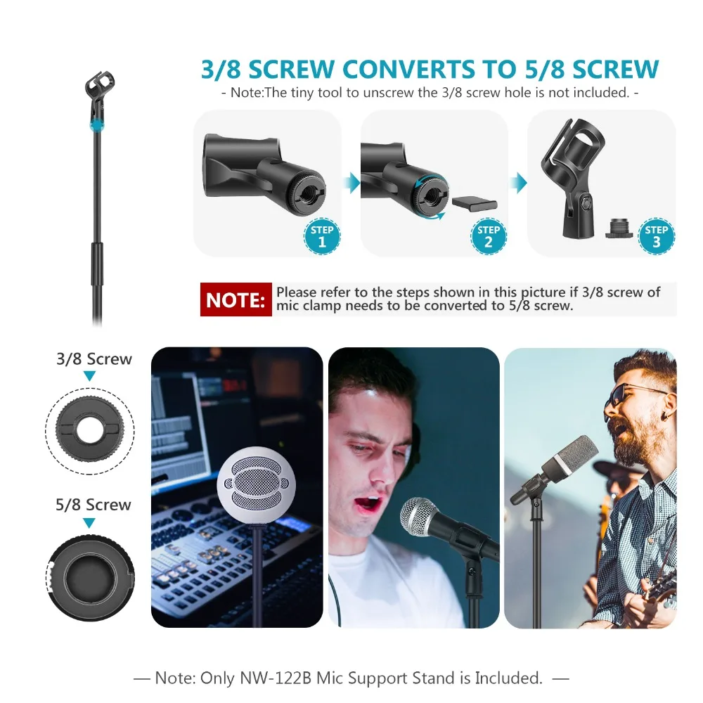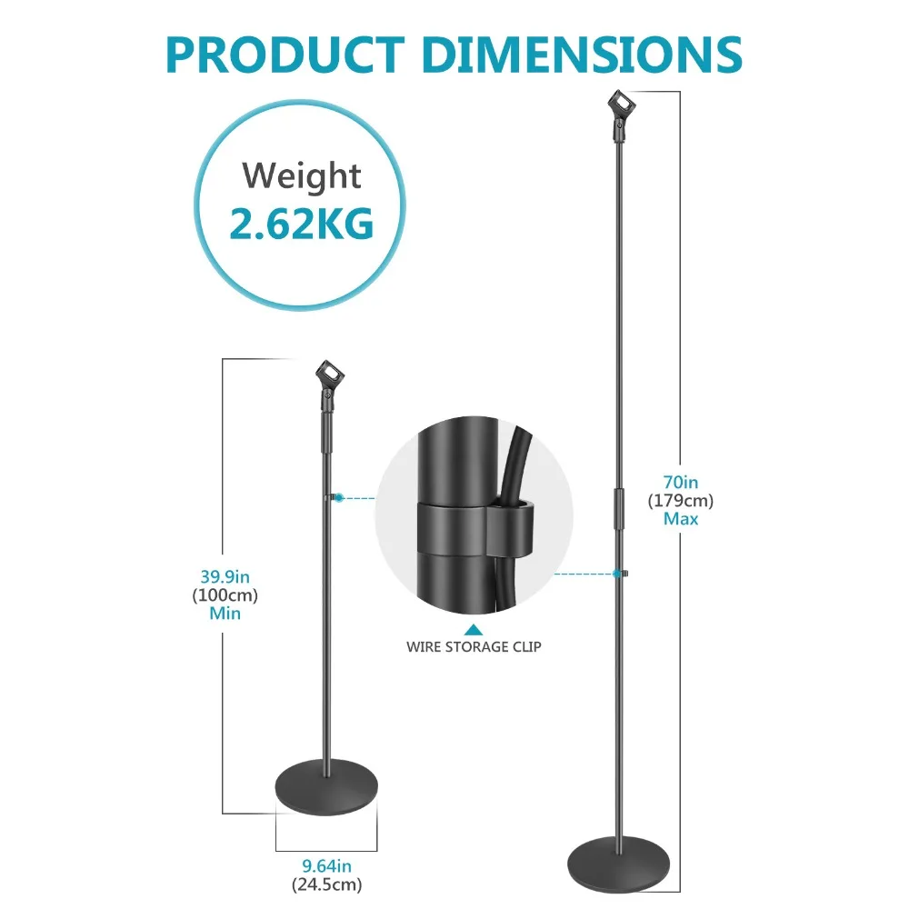 HEIGHT ADJUSTABLE: With standard 5/8 x 27 external thread, it's easy for you to install and adjust the height of the stand from 39.9 to 70 inches/100 to 179 centimeters; NOTE: Microphone is NOT included RELIABLE AND STURDY: Its solid base provide stability and precise balance to avoid it from falling CONVENIENT TO TRANSPORT: Durable for long term use; Detachable and extendable, easy to install and convenient to transport STUDIO AND CONCERT USE: Perfect mic holder positioning and optimal pickup for stage, studio, concert, etc COMPATIBILITY: The mic holder fits for most types of microphones