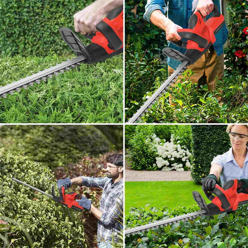 [2024 Updated cordless hedge machine] An electric hedge machine trims hedges and shrubs into shape, helping you keep your yard tidy but avoiding the hassle of wires. Upgraded battery hedge trimmers feature dual blades that move back and forth very quickly to evenly cut off excess leaves and branches. In addition, the 3/5-inch wide tooth slot makes the cord-electric hedge machine tough over a wider range, suitable for most hedges of sizes and shapes, and easy to handle different scenarios.