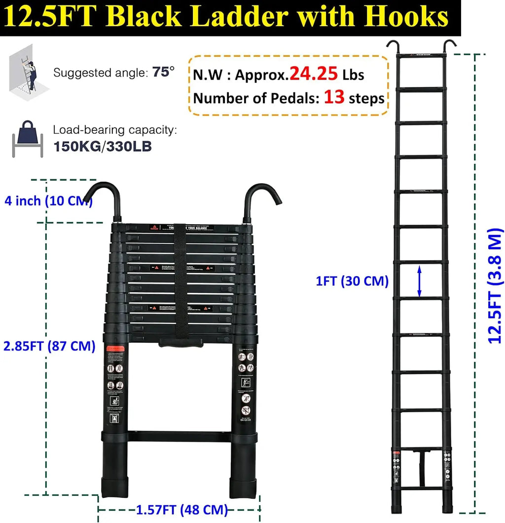 ★12.5ft Telescopic Extension Ladder with Detachable Hook