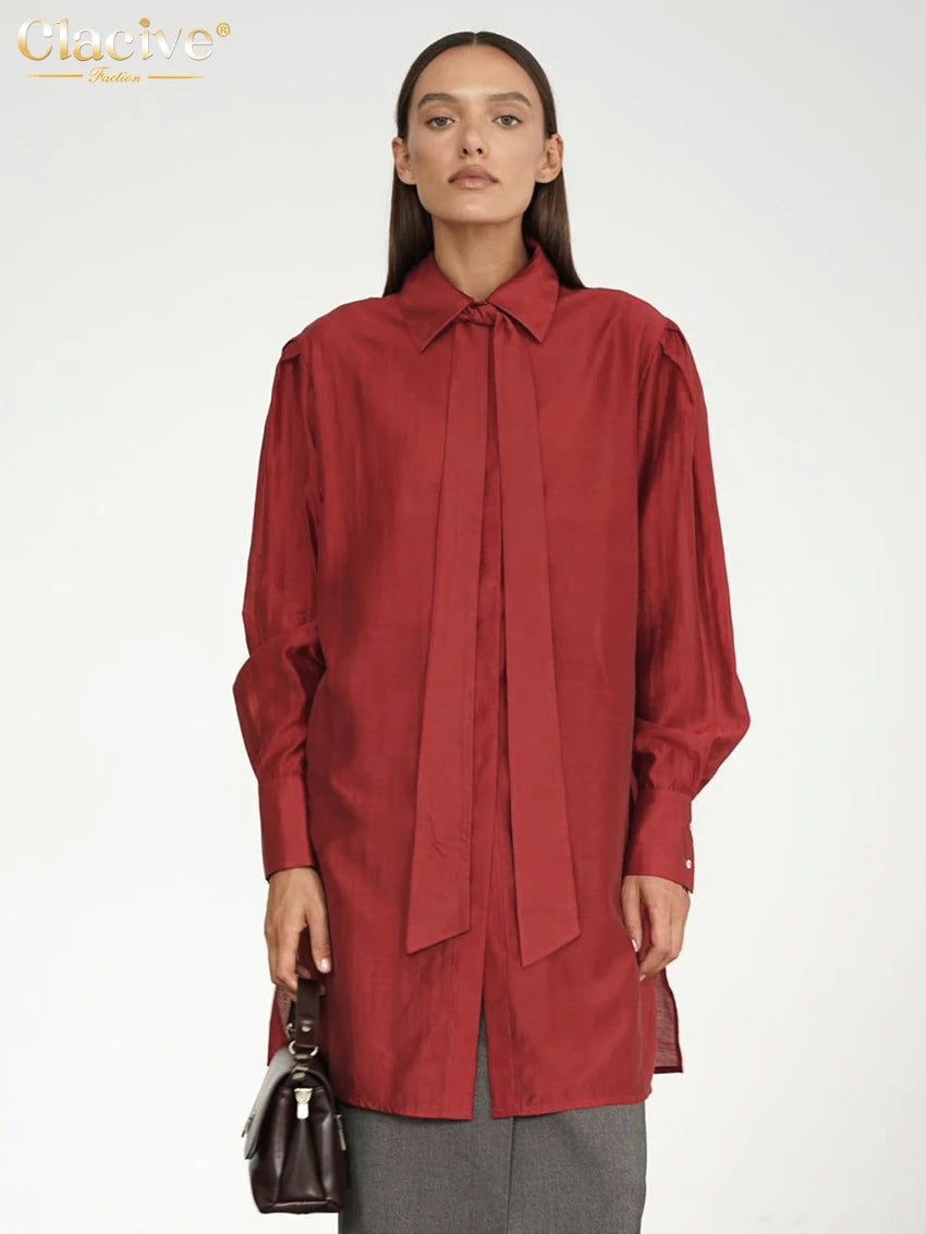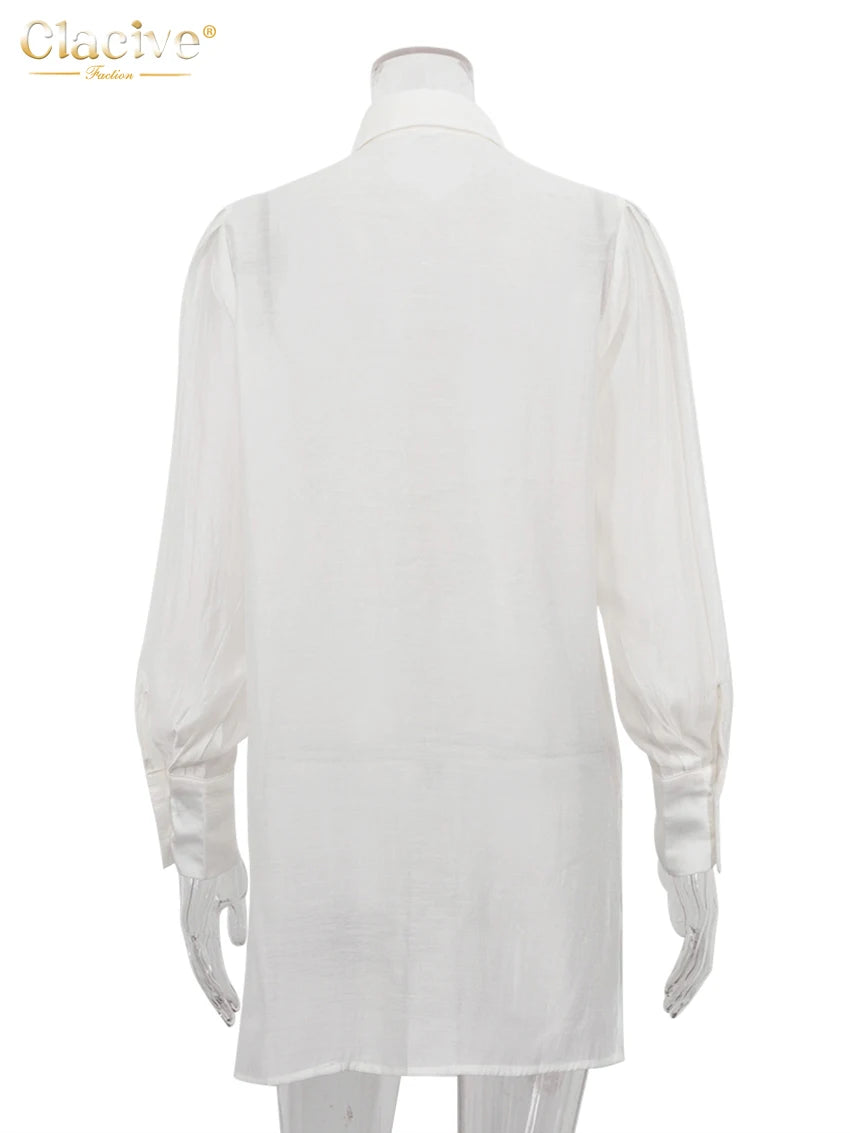 Clacive Fashion Loose White Women Blouse 2025 Casual Lapel Long Sleeve Shirt Elegant Classic Tie See Through Top Female Clothing