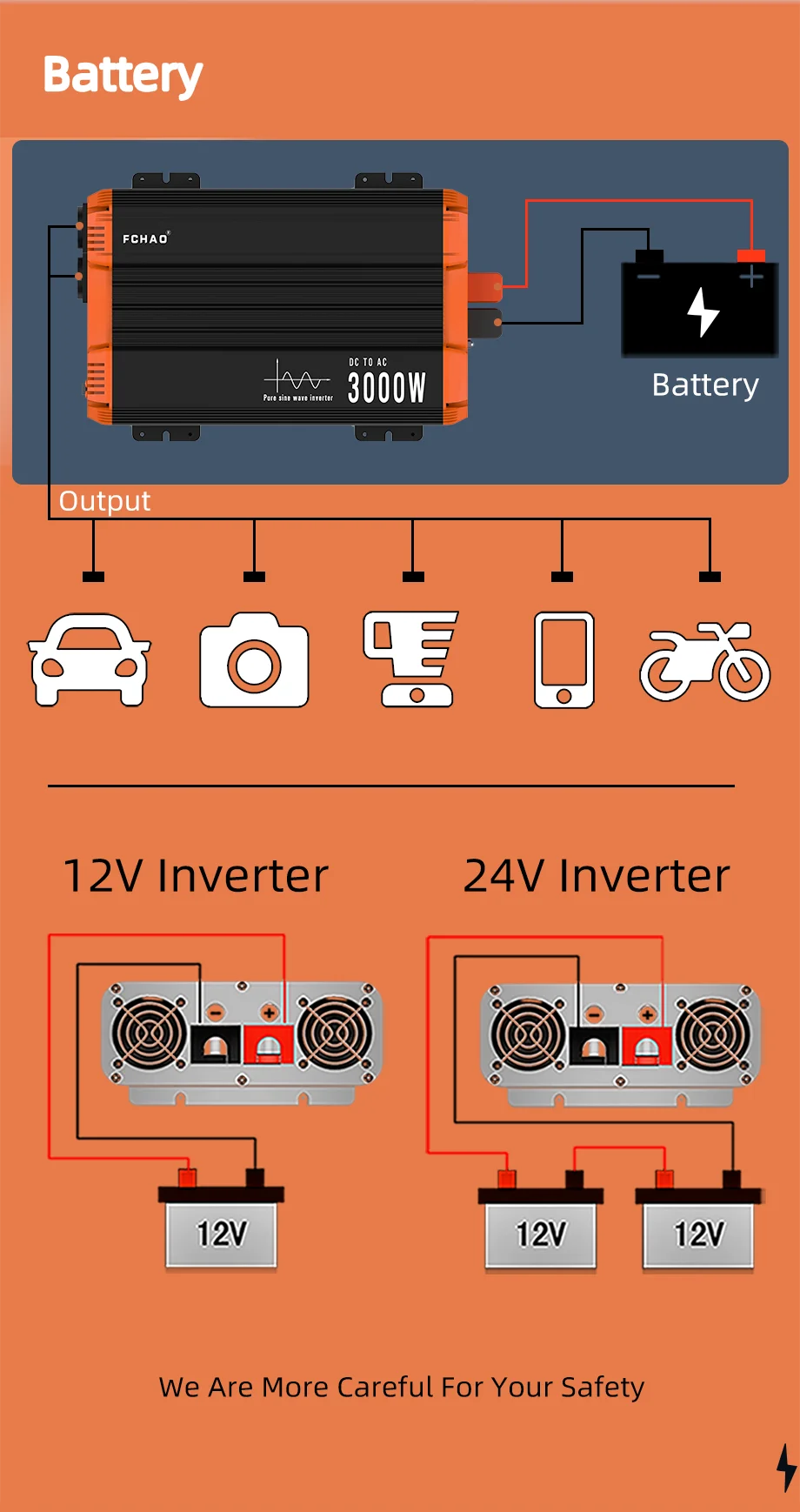1. Pure sine wave, intelligent filtering, does not interfere with electrical appliances, and protects electrical appliances. The conversion efficiency is high (up to 95%), and the power consumption of the product itself is low, which can greatly extend the battery life.