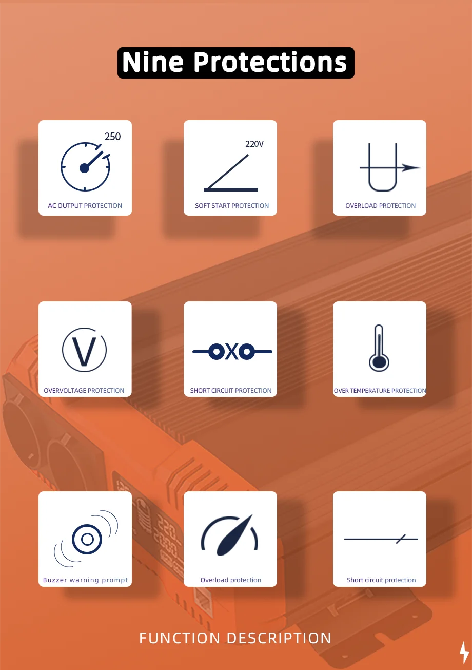 2. Buzzer reminder. Once the protection function of the inverter is triggered, the inverter will immediately shut down the power supply, the load will enter the protection mode, and the buzzer will remind people.