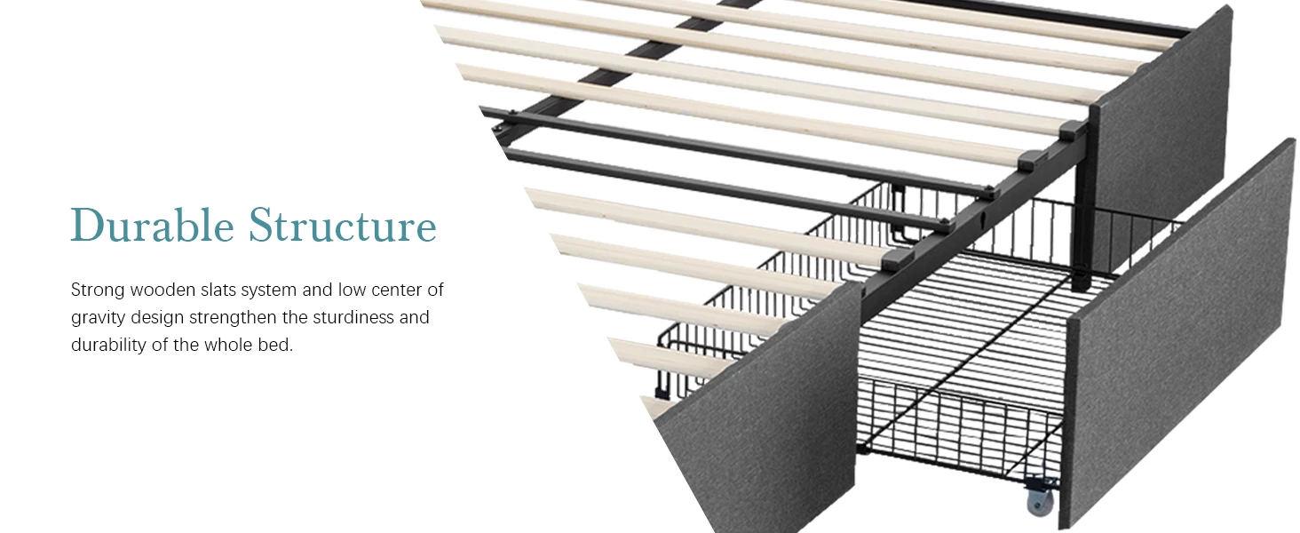 Durable Structure: Featured with strong wooden slats system, plus low center of gravity design strengthen the sturdiness and durability of the whole bed structure