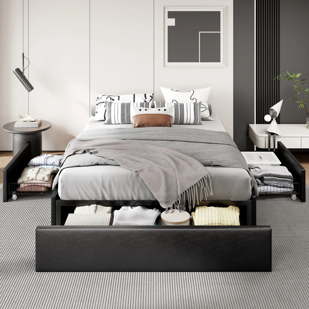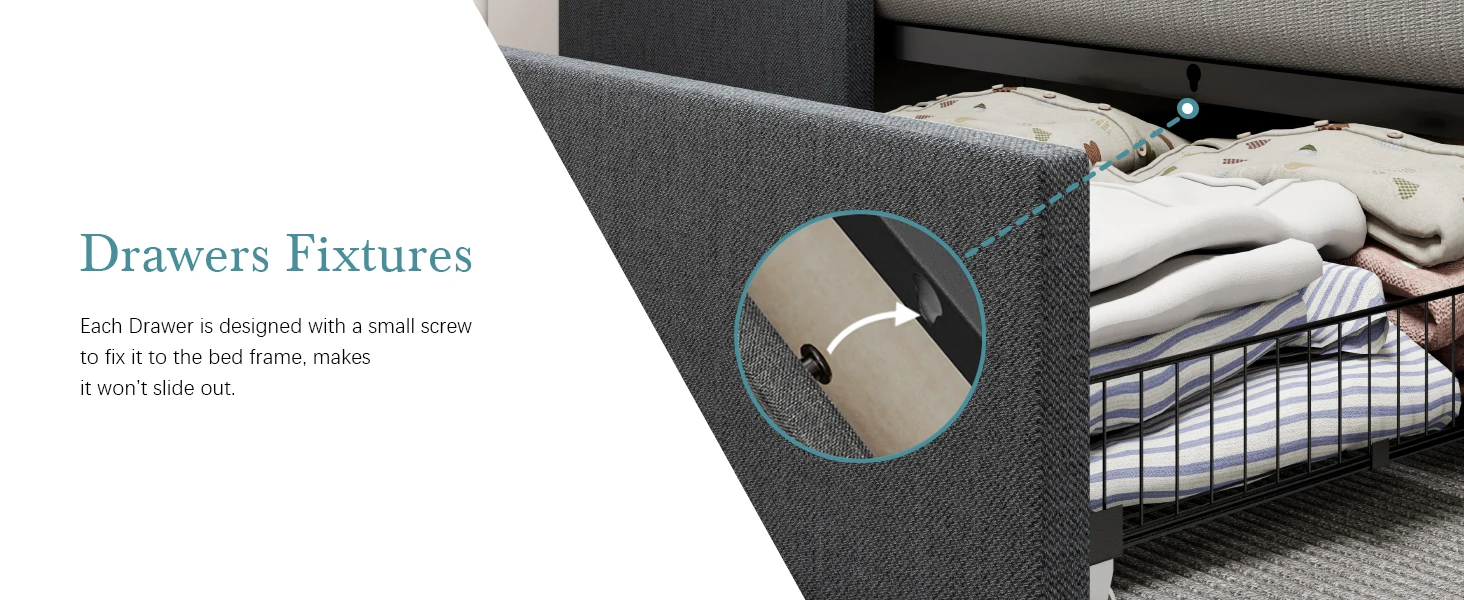 Ample Storage Space: Designed with 1 side drawers on each side and 1 large drawer at the bed end, offers a perfect storage space for bed sheets, accessories, off-season clothing, etc