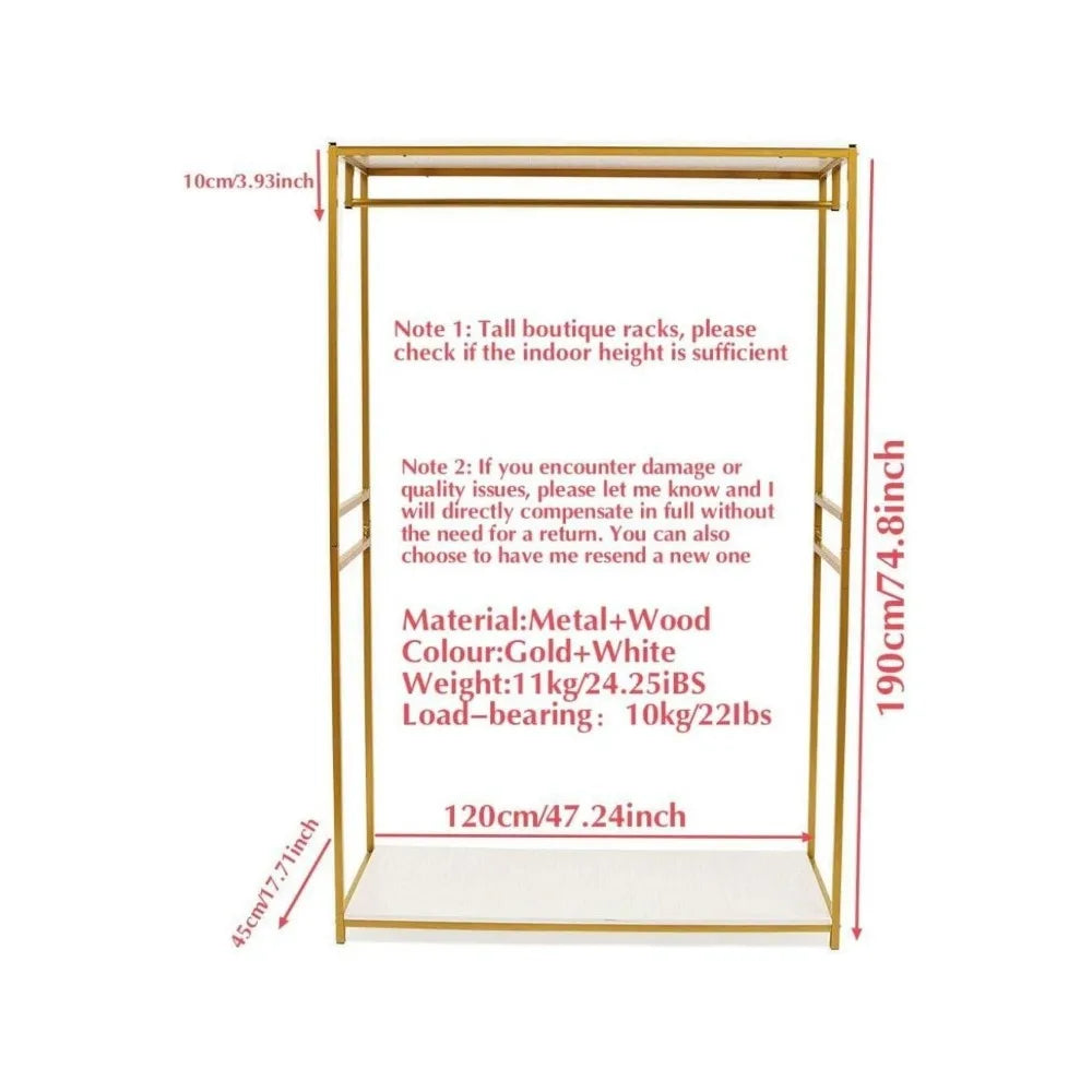 • (2) The combination of white wooden storage partitions at the top and bottom and golden metal hanging rack is classic and beautiful, making it not only a high-end clothing display stand, but also a perfect choice for decorating the space. Solid base design provides additional storage for showcasing high-end bags, high heels, and more