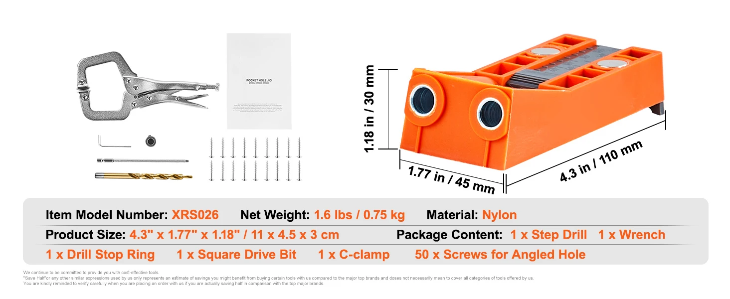 All Your Favorite Accessories: Our jig pocket hole system includes 1 x step drill, 1 x wrench, 1 x drill stop ring, 1 x square drive bit, 1 x c-clamp, 50 x screws for angled hole. Speed up your drilling and simplify your wooden furniture installation with our all-inclusive kit.