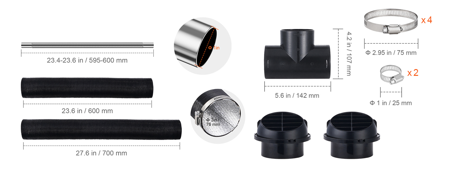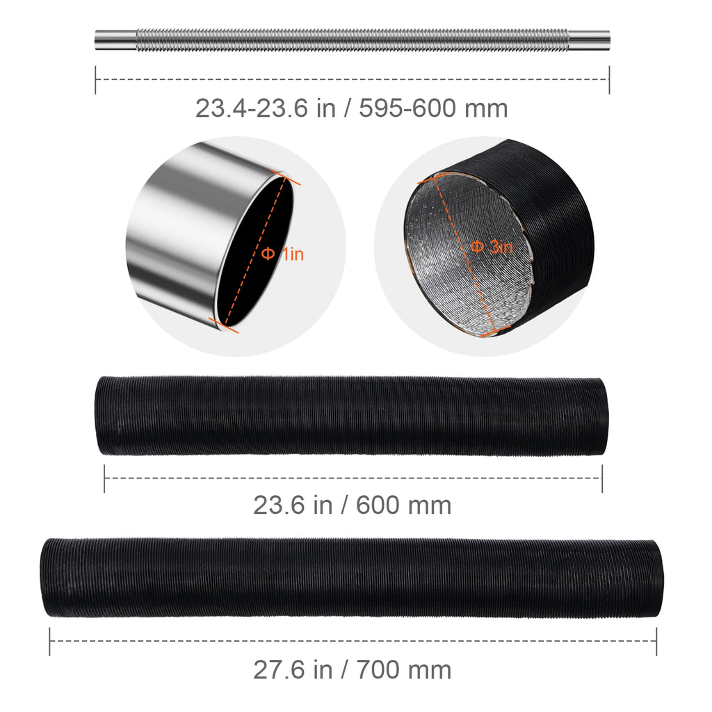 • Extendable Air Outlet Ducts: Features an adjustable length from 23.6 to 27.6 inch (600-700mm), designed to fit various models. The diesel heater air duct hoses are constructed with a light-resistant black film exterior and a durable, high-temperature-resistant aluminum foil interior, ensuring longevity and resistance to damage.