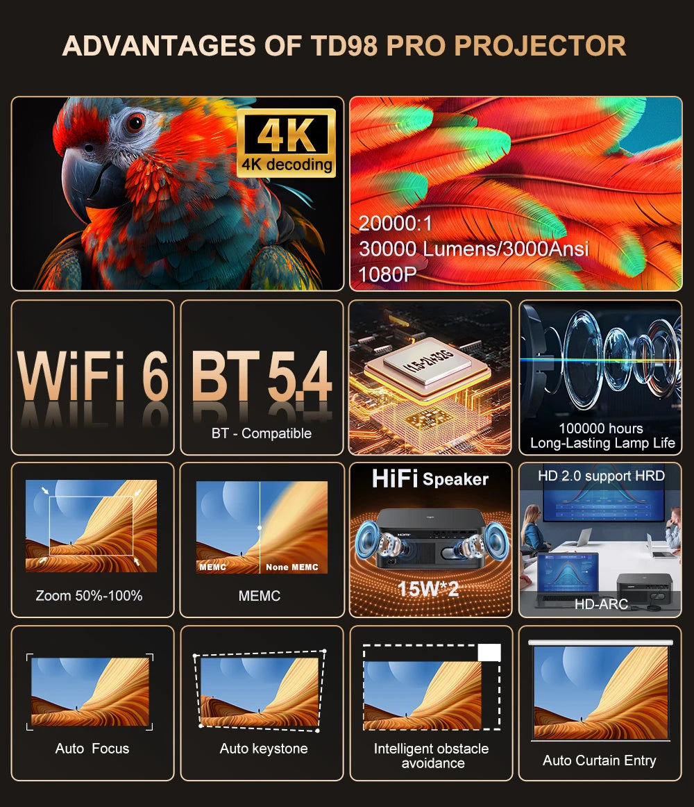 This 1080P projector fully adapts to native 4K content, providing sharp, vibrant images that reveal every detail.Enhanced by high-transmittance lenses, and HDR 10+ tech , this smart projector ensures natural light-to-dark transitions, rich colors, and lifelike skin tones.