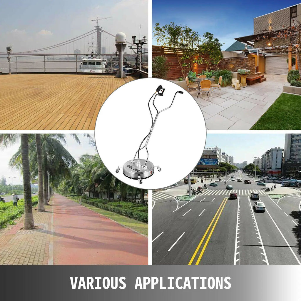 This surface cleaner is suitable for cleaning horizontal surfaces, used on the road, driveways, decks, patios, sidewalks, driveways, pool decks, parking lots, etc.