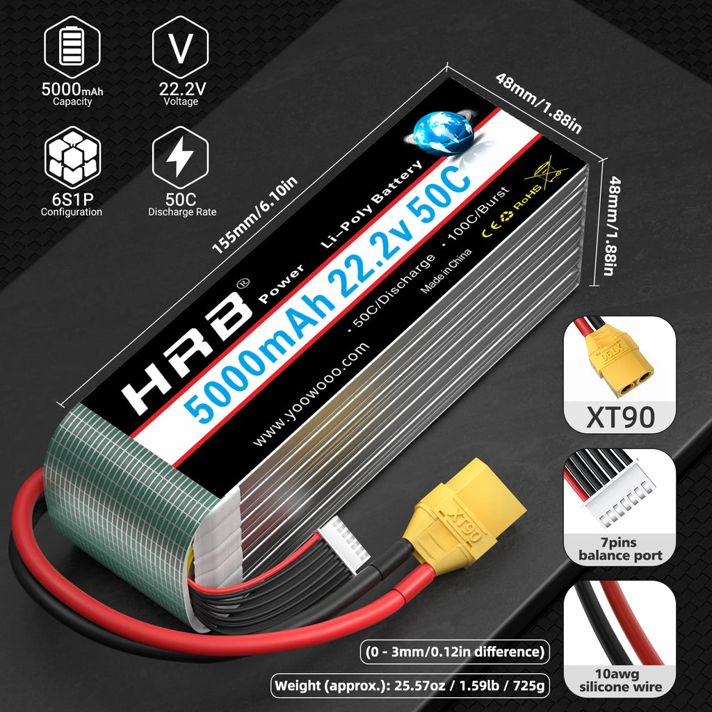 HRB 6s 5000mah lipo battery with xt90 plug, superior Lithium Polymer raw materials, up to 311Wh/kg energy density, long cycle life