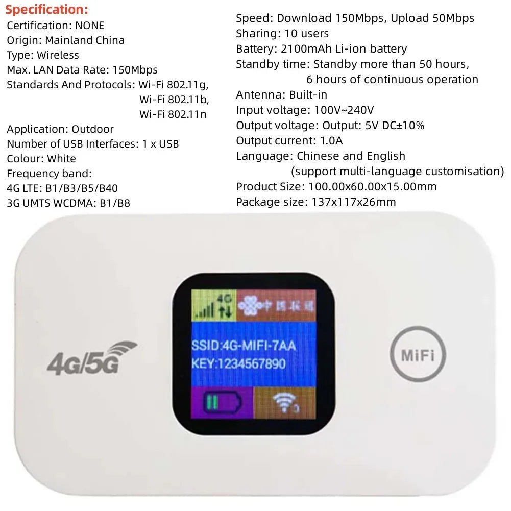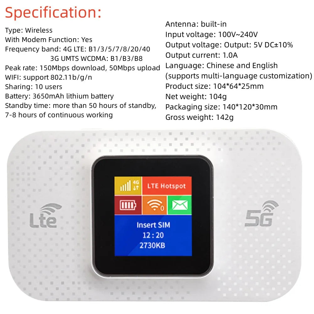 Feature: 1.Easy Setup: Setting up the 4G Lte WIFI router is straightforward. Simply slide down the back cover, insert the SIM card with the chip facing down, plug the USB port into a power source to get WiFi, and you're ready to connect to the internet. 2.Customizable WiFi Settings: Once connected to the WiFi, you can modify the WiFi name and password and add APN through a user-friendly browser-based backend accessible at 192.168.100.1, ensuring your network stays secure and personalized. 3.Frequency Band Verification: Before purchasing, customers can check the frequency band compatibility with their local region by visiting the provided links (Frequency Check, Network Bands, List of LTE Networks). This ensures the device will work seamlessly in the buyer's location. 4.Manual Measurement: Please allow for a slight 0-1 cm difference due to manual measurement. Color variations may occur depending on light conditions and the way the listing is viewed. 5.Customer Appreciation: Your understanding and attention are greatly appreciated. We wish you a pleasant shopping experience! Specification: Origin: Mainland China Type: Wireless With Modem Function: Yes Color: black, white (optional) Frequency band: 4G LTE: B1/3/5/7/8/20/40 3G UMTS WCDMA: B1/B3/B8 Peak rate: 150Mbps download, 50Mbps upload WIFI: support 802.11b/g/n Sharing: 10 users Battery: 3650mAh lithium battery Standby time: more than 50 hours of standby, 7-8 hours of continuous working (individual operations vary, subject to actual conditions.) Antenna: built-in Input voltage: 100V~240V Output voltage: Output: 5V DC±10% Output current: 1.0A Language: Chinese and English (supports multi-language customization) Product size: 104*64*25mm 4.09x2.52x0.98inch Net weight: 104g Packaging size: 140*120*30mm Gross weight: 142g Color: black, white (optional) Frequency band: 4G LTE: B1/3/5/7/8/20/40 3G UMTS WCDMA: B1/B3/B8 Peak rate: 150Mbps download, 50Mbps upload WIFI: support 802.11b/g/n Sharing: 10 users Battery: 3650mAh lithium battery Standby time: more than 50 hours of standby, 7-8 hours of continuous working (individual operations vary, subject to actual conditions.) Antenna: built-in Input voltage: 100V~240V Output voltage: Output: 5V DC±10% Output current: 1.0A Language: Chinese and English (supports multi-language customization) Product size: 104*64*25mm 4.09x2.52x0.98inch Net weight: 104g Packaging size: 140*120*30mm Gross weight: 142g