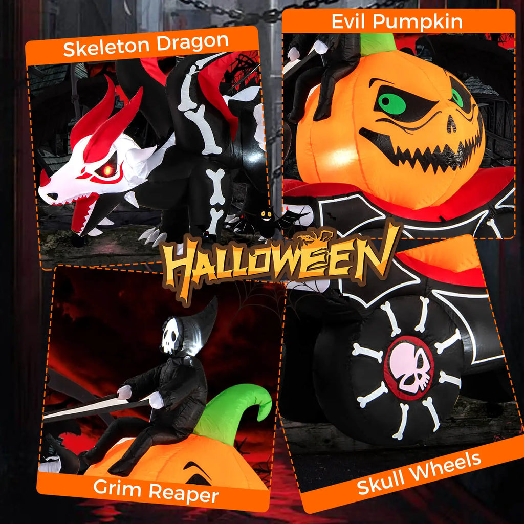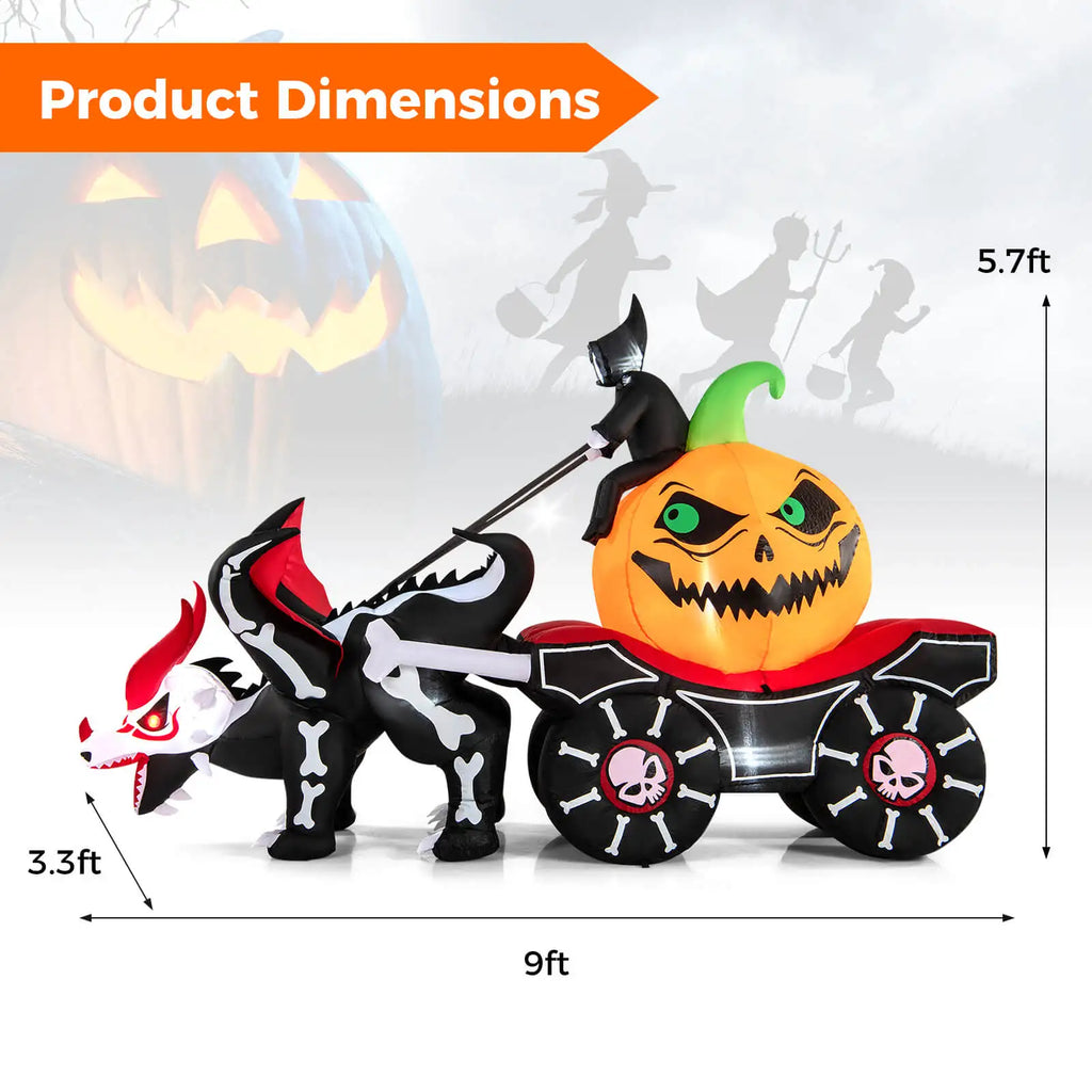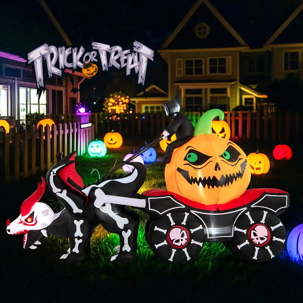 This 9-foot-long grim reaper driving a pumpkin carriage brightens up your outdoor space with 7 built-in LED lights. Made from weather-resistant polyester fabric, the blow up carriage is designed to withstand the elements while spreading spooky fun to those who pass by. The Halloween inflatable is easy to set up with the self-inflating design. When the festivities are over, you can simply deflate and store it for convenience. The blow up decoration is perfect for a variety of Halloween activities, creating a haunted landscape that is sure to impress.