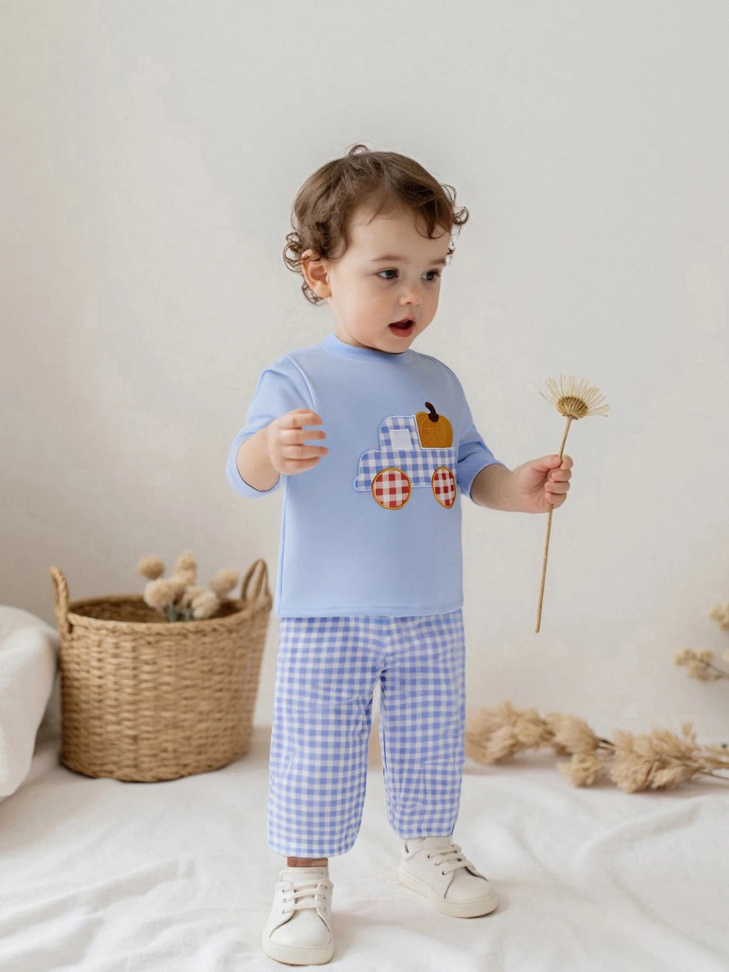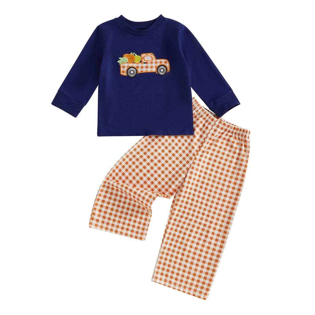 Toddler Little Boy Halloween Outfit Pumpkin Truck Embroidered Long Sleeve Tops Plaid Pants 2 Piece Set
