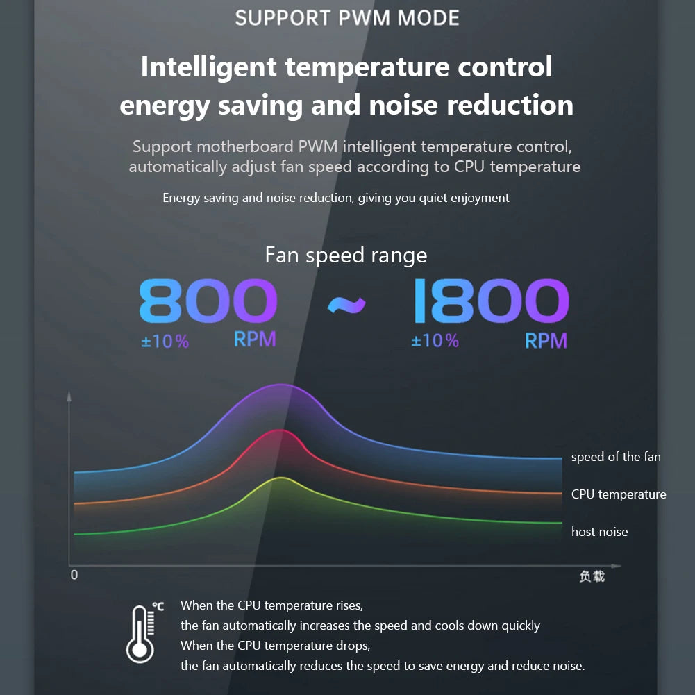 5. Intelligent temperature control, energy saving and noise reduction: Support motherboard PWM intelligent temperature control, automatically adjust the fan speed according to the CPU temperature, save energy and reduce noise, giving you a quiet enjoyment. The fan is equipped with 8 pieces of rubber feet, which can effectively reduce vibration and noise, giving you a quiet and comfortable enjoyment.
