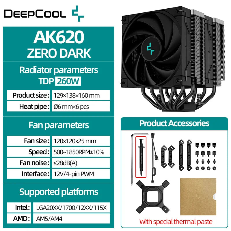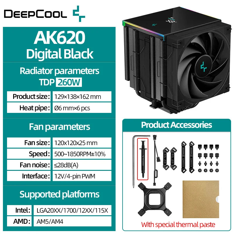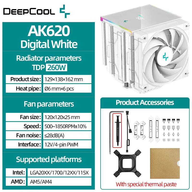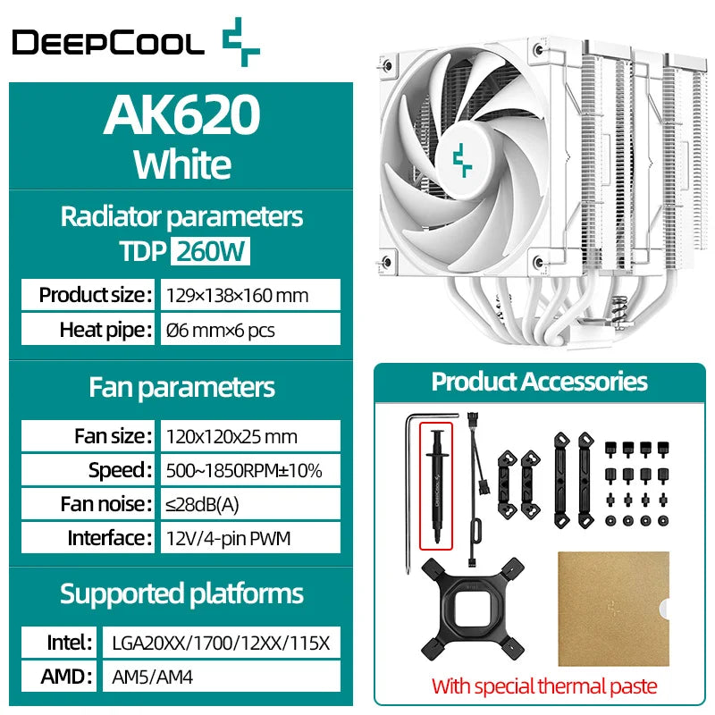 DeepCool AK620 Twin Towers CPU Air Cooler 6 Heatpipes White Dual Cooling Fans Radiator For LGA1700 2011-v3 115X 1200 AMD AM4 AM5