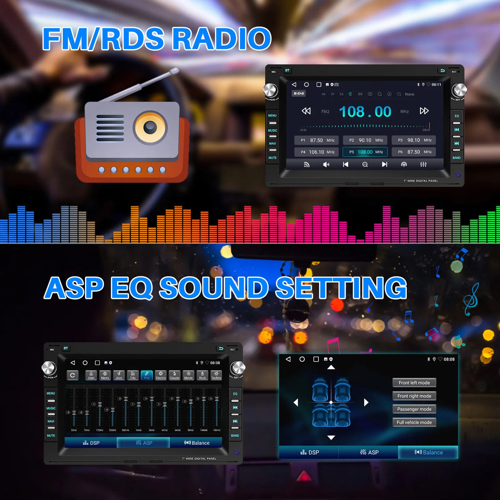 RDS/FM Radio & Bluetooth & ASP Sound Setting: Supports Bluetooth 4.0, with built-in microphone so you can make hands-free calls while driving. Support access to phone book, music playback interface, etc. RDS supported. You can save 18 FM radio stations. Built-in ASP chip. Supports 32-band EQ setting, which can be adjusted according to your personal preference. Which is very similar to your original sound. 4 x 45W amplifier, surround sound and subwoofer output