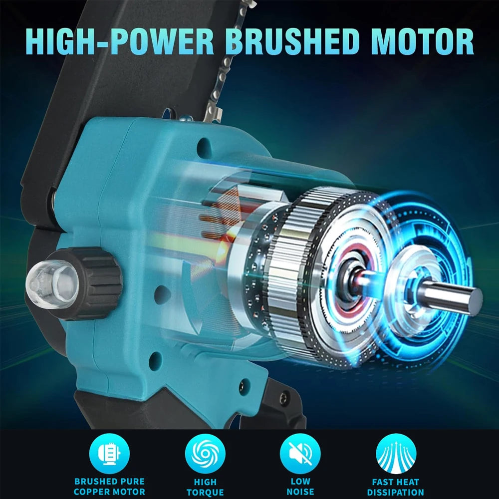Jemi Tool 6 inch portable cordless rechargeable electric chain saw with two batteries, wood cutter, garden orchard pruning tool