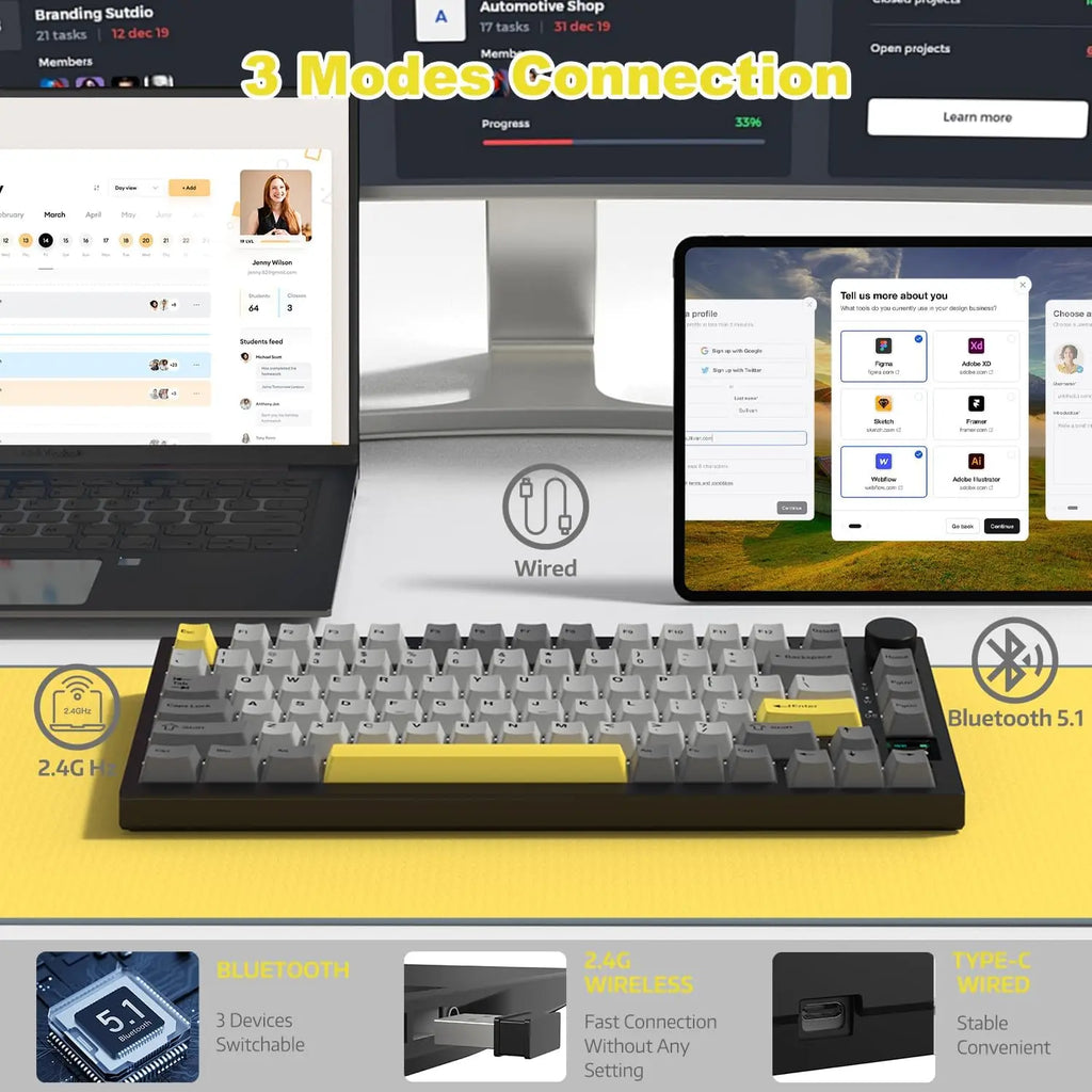 • [Wireless & Wired Connectivity] The A.JAZZ 75 percent keyboard can easily switch among 3 connection via Bluetooth or 2.4GHz for wireless connectivity, or with the included Type-C USB cable.Compared with former versions,Bluetooth 5.1 mode is featured with faster responses,perfect for desktop computers, smartphones, tablets and laptops.With the built-in 4000mAh large-capacity battery,don’t worry for vacations and business trips.
