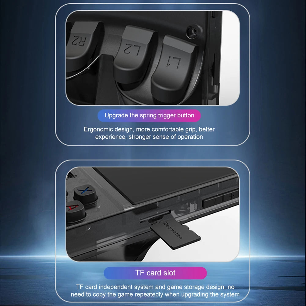 2.Ergonomic Design: The Portable Hand Held Video Player is crafted for comfort, featuring system optimizations for smooth operation and includes a storage bag and screen protector. 3.Supports 30+ Emulators: Enjoy the variety of gaming options on the Retro Gaming Console, which supports diverse types and styles of games for endless entertainment. 4.Professional Gaming Chip: Equipped with the professional RK3326 chip, the Portable Mini Retro Handheld Game Console runs smoothly without lag, effortlessly handling large 2D and some 3D games. 5.Extended Battery Life: With a TYPE-C charging port, the Video Gaming Console offers a 4000mAh battery capacity for prolonged playtime, ensuring you enjoy uninterrupted gaming. Specification: Origin: Mainland China System: Open Source for Linux CPU: RK3326 original chip RAM: EMMC 1GB+8GB Screen: 4.0-inch IPS OCA fully laminated HD MIPI screen 720*720 resolution Built-in emulator: Support: for MAME/ for N64/ for PS1/ for NEOG10/ for GBA/ for FC/ for SFC/ for MD/ for CPS1/ for CPS2/ for CPS3/for PlayStation Portable 64GB: 18000+ games, 128GB: 22000+ games Package weight: 375g Product size: 153.00x83.00x35.00mm/6.02x3.27x1.38inch Note: Due to the limitation of CPU function, it may not be compatible with all games, and it is normal that some games are not supported. Note: