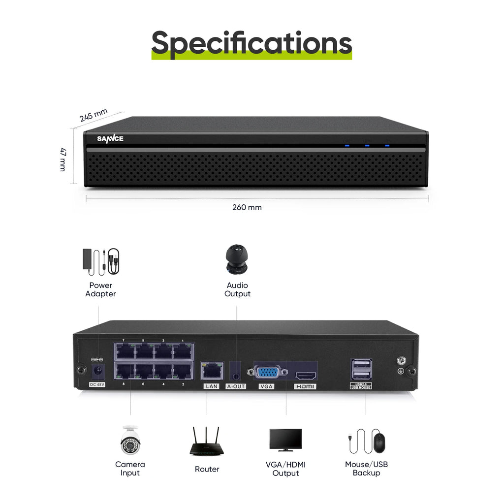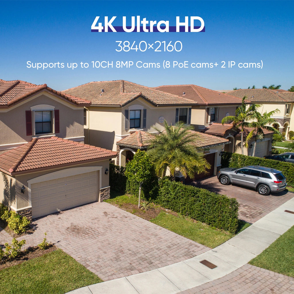 8MP Full HD - Supporting up to 8CH 8MP cameras in total, you can hook up 8CH PoE cameras plus 2CH IP cameras. Just build up your security web according to your needs. The POE NVR is the perfect choice for your surveillance system. With its 10-channel 8MP HD camera input and 4K HD quality, you can rest assured that your security is in good hands. The 8 100Mbps PoE ports are compliant with the IEEE 802.3af/at standard, providing a reliable and secure connection with up to 30W of power per port.
