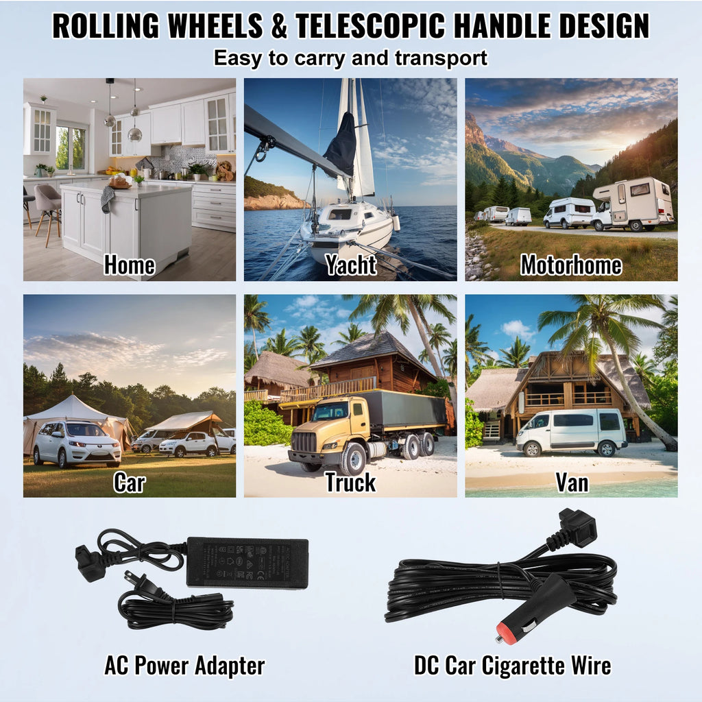 • Dual Use for Home/Car: Designed with sturdy wheels and a telescopic handle for effortless and stable transportation. Additionally, the car fridge is equipped with 110/240V AC and 12/24V DC adapters, making it suitable for use at home, on yachts, RVs, cars, trucks, and vans.