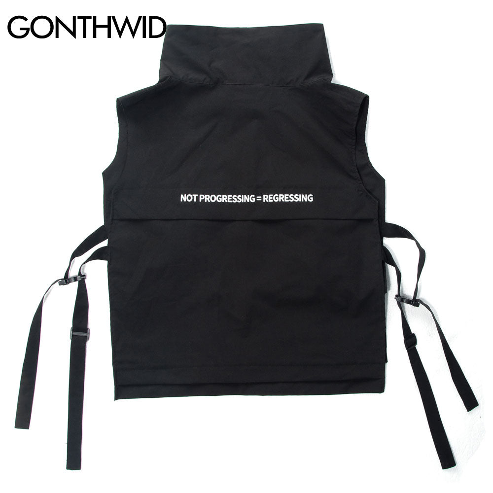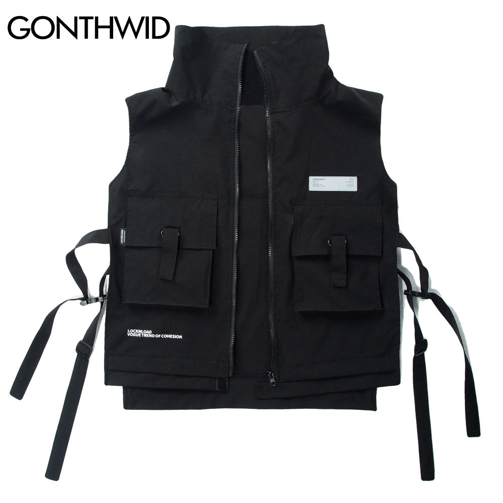 GONTHWID Multi Zipper Pockets Cargo Waistcoat Tooling Vest Streetwear Men Fashion Side Ribbon Buckle Zip Sleeveless Jackets Tops