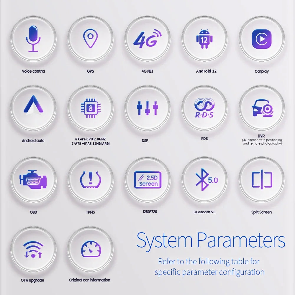 Android 12 + 7 inch Display Screen + Quad Core 1.2GHZ (Eight core UIS 7862A 1.8Ghz / UIS 7862S 2.0Hhz optional)+ DDR3 1GB Flash (2GB/3GB/4GB/6GB/8GB optional) + 16 GB Memory (32GB/64GB/128GB optional) + WIFI (4G Network optional)+ Mirror link+ Steering Wheel Control + RDS+DSP(optional)