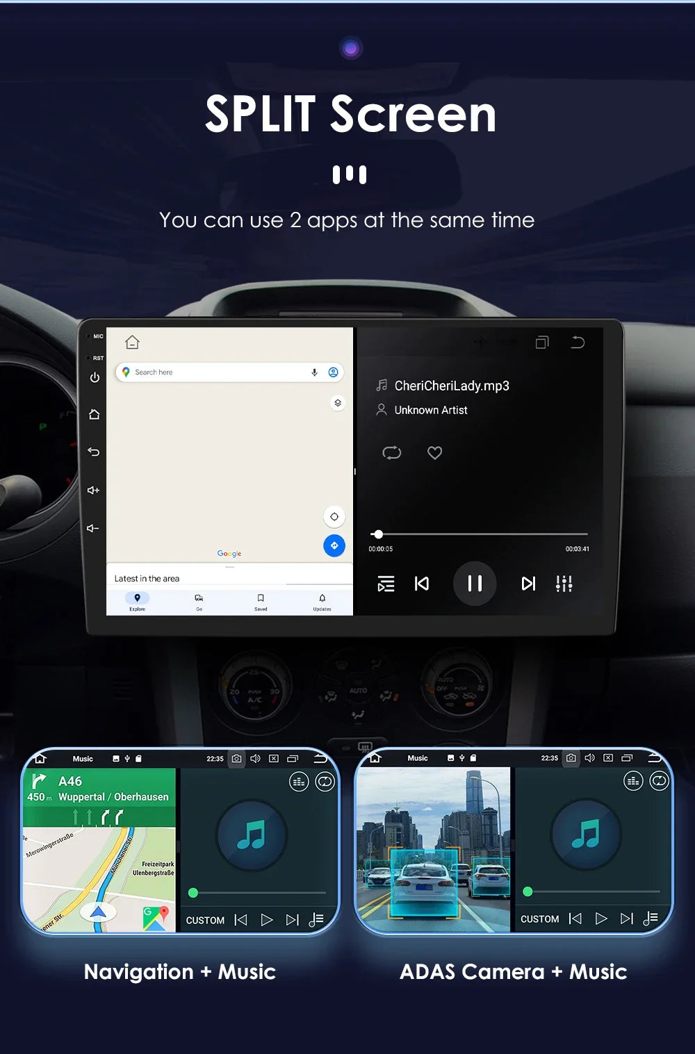 Split Screen : You can use 2 apps at the same time (such as: Navigation + Music , ADAS Camera + Music ,etc.)