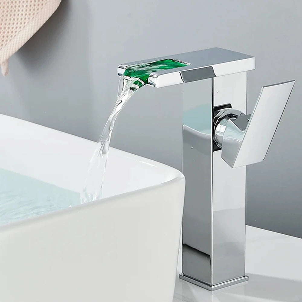 Luxury LED Color Changing Waterfall Basin Sink Faucet Single Handle Deck Mounted Hot and Cold Mixer Tap