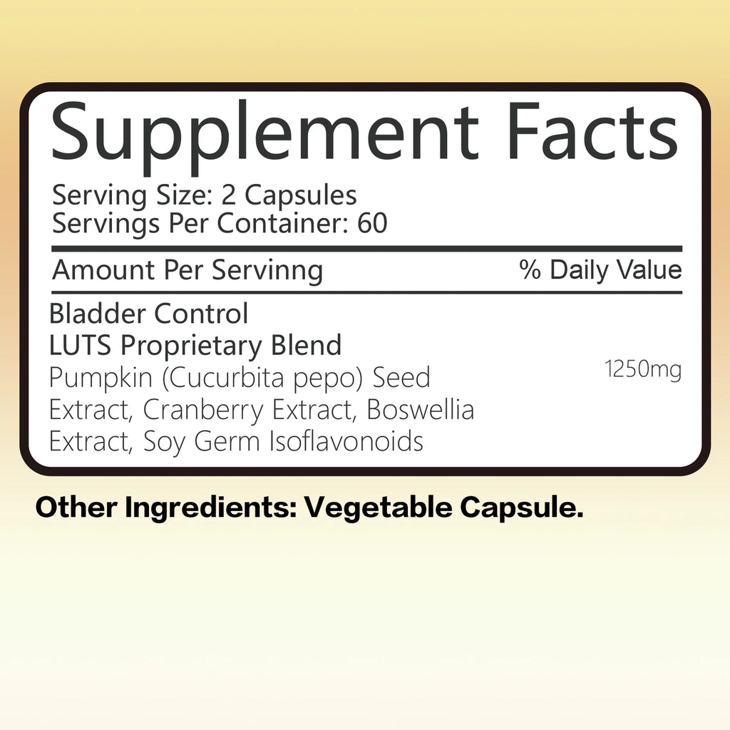 A bladder support supplement that helps support bladder control and prevent urinary incontinence, bladder incontinence, urine leakage, and weak bladder. It contains a proprietary blend of clinically studied bladder control nutrients including pumpkin seed extract, soy isoflavones, and cranberry to help relieve urinary incontinence, thereby reducing the urge to go to the bathroom.